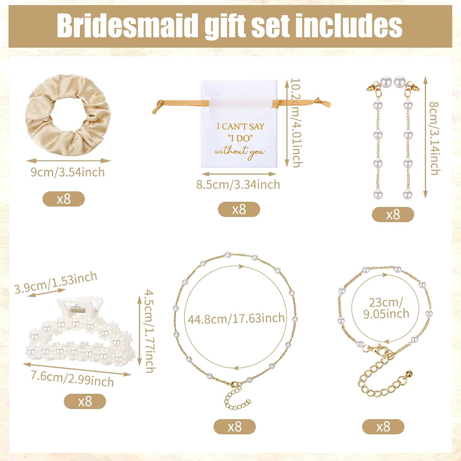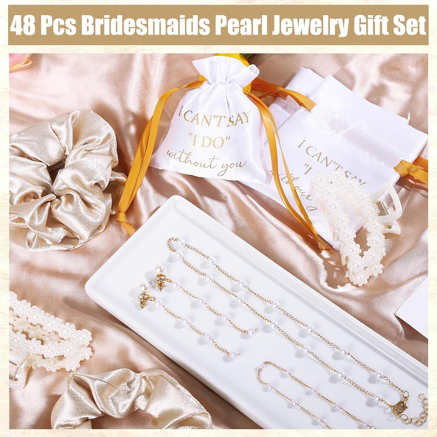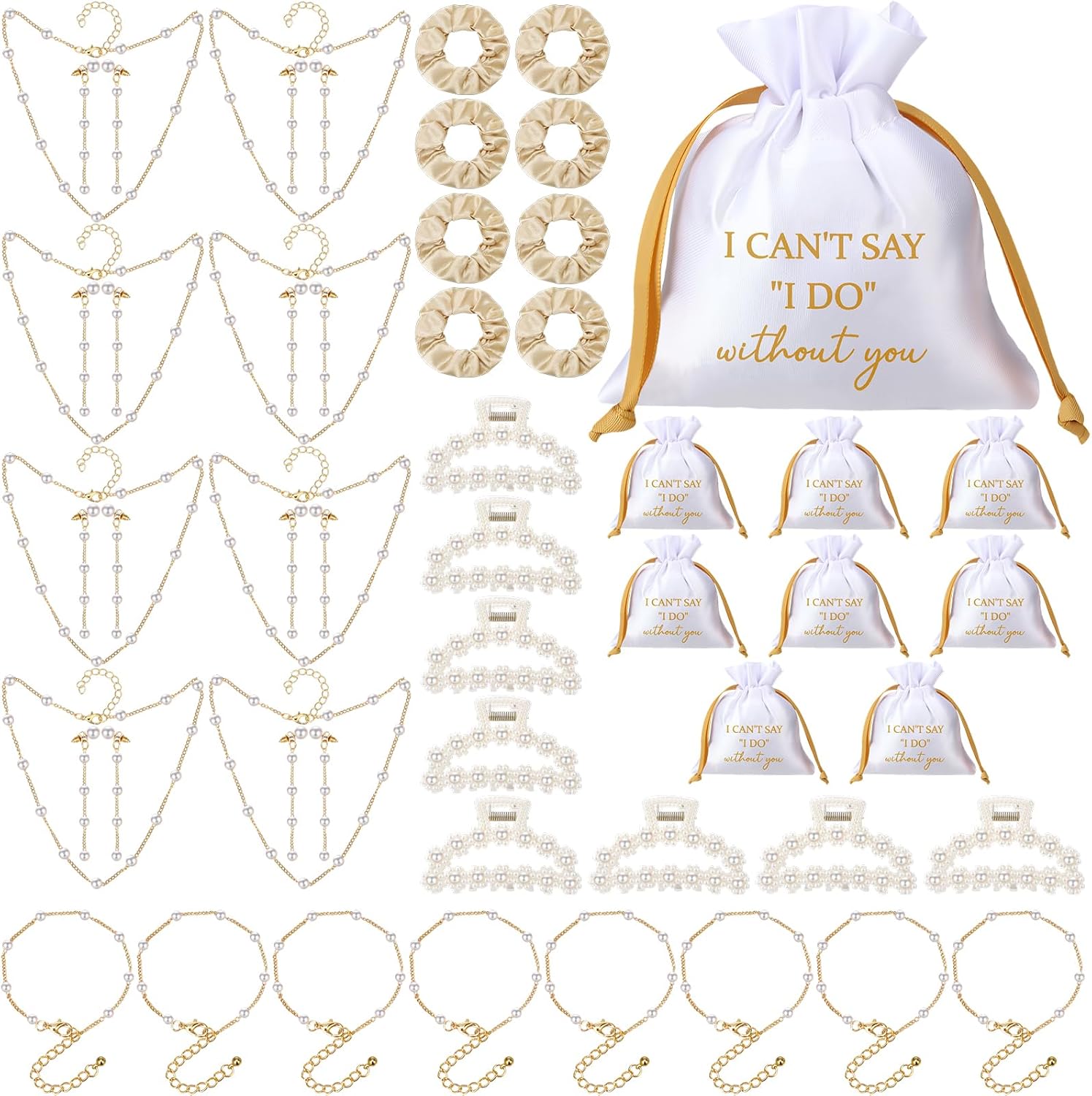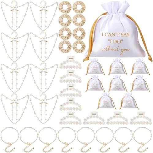 - Package Included: This package includes 8 pcs scrunchies, 8 pcs pearl hair claw clips, 8 pcs bridesmaid jewelry bags, 8 pcs pearl necklaces, 8 pcs pearl bracelets and 8 pcs earrings, a total of 48 pieces, enough to meet your wedding jewelry needs