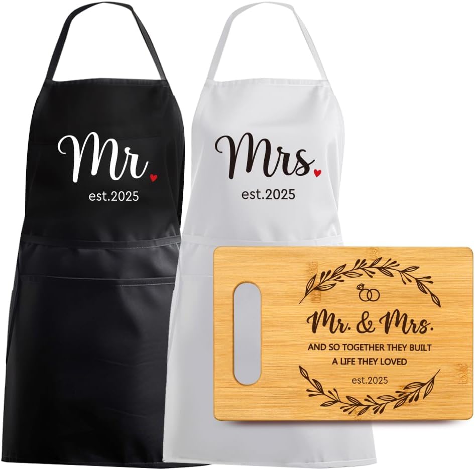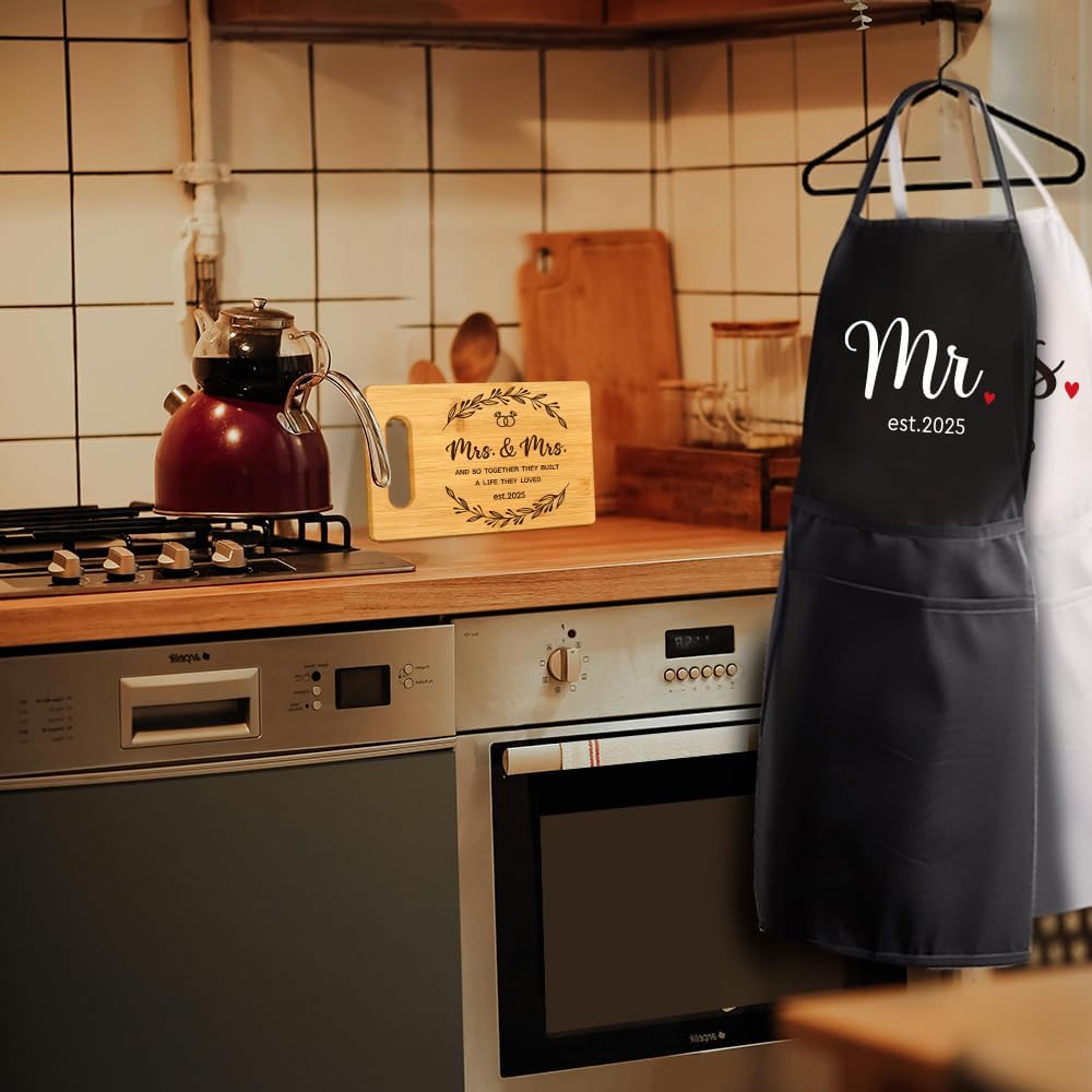 • 【Unique Couple’s Gift】 Cutting board Size:8x12inch. Aprons Size:27.5×31.5inch, 2pcs. The Mr & Mrs Aprons with Pocket Cutting Board set is a distinctive choice for wedding gifts for couples in 2025, blending practicality with a personal touch
