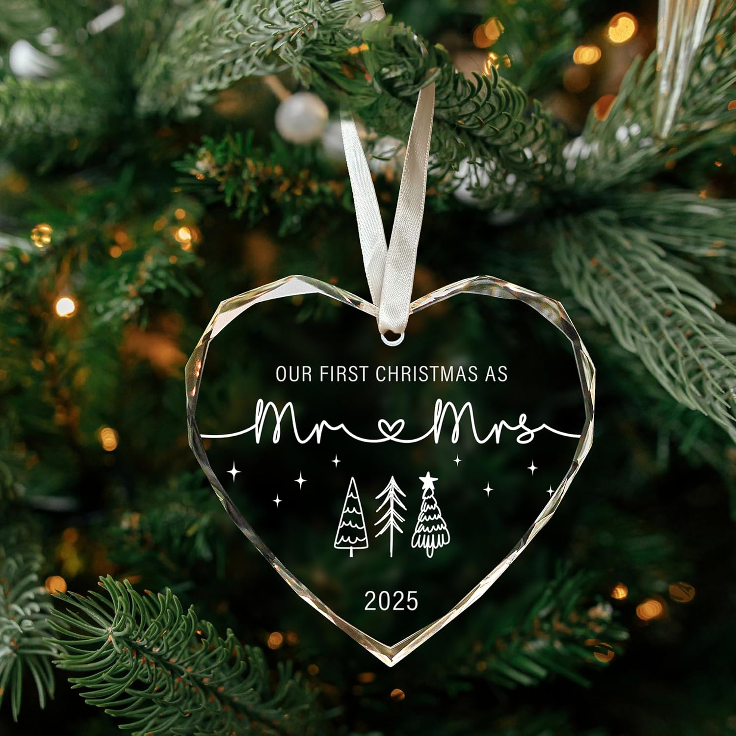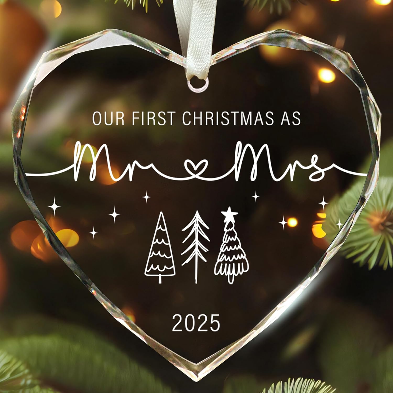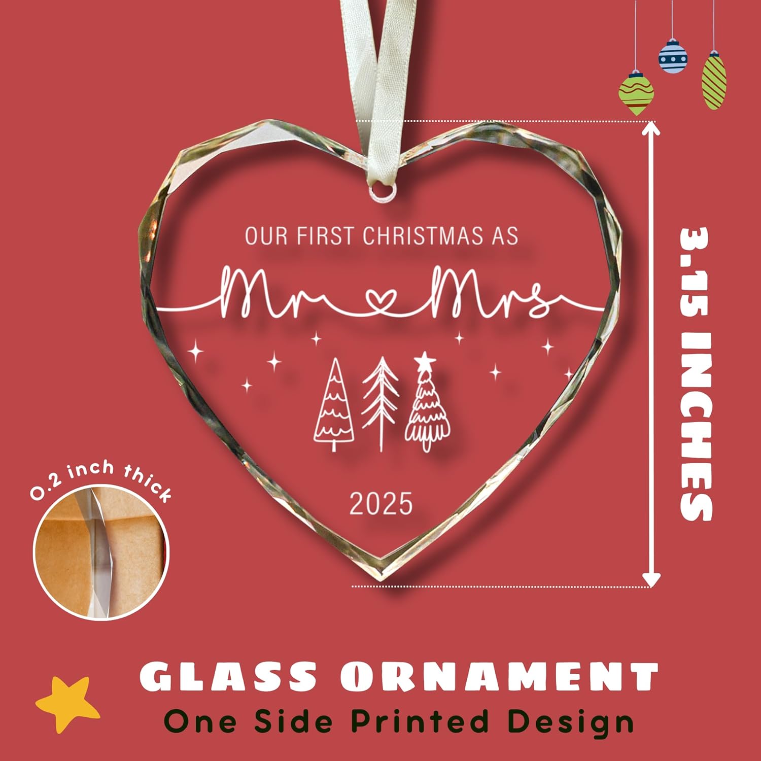 - CRAFTED FROM PREMIUM GLASS: Made from durable glass, our first christmas as mr and mrs 2025 features a smooth surface that’s both sturdy and visually appealing. The vibrant double-sided print resists fading and wear, allowing it to maintain its original charm through many festive seasons.