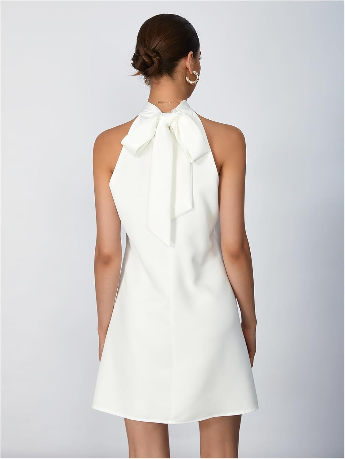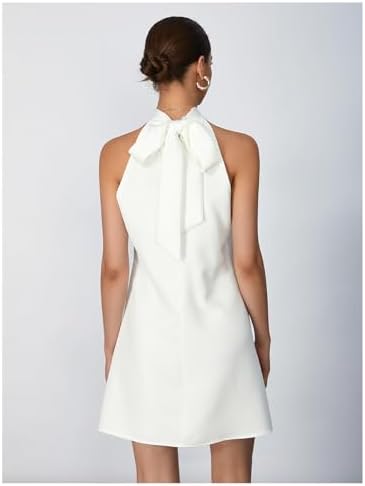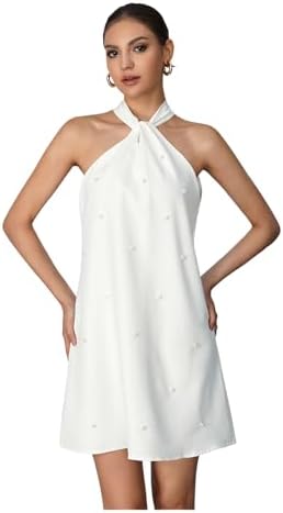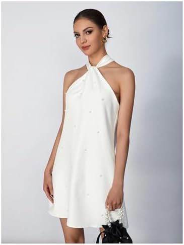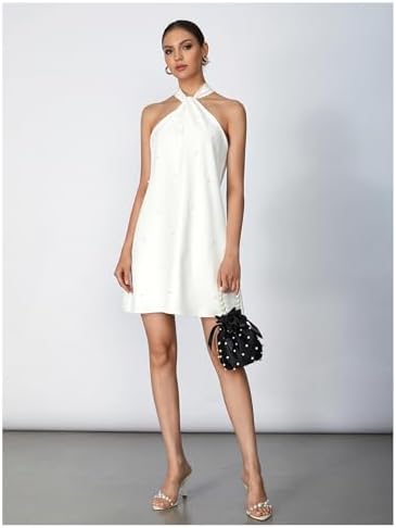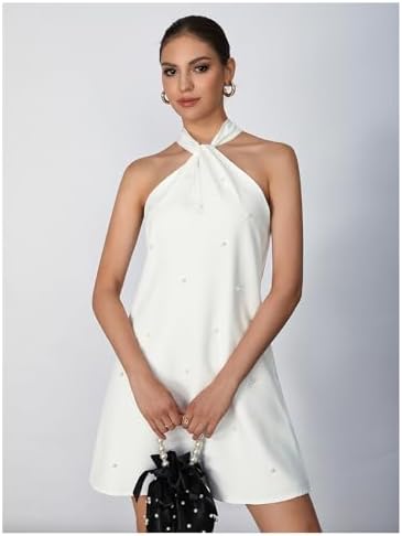 - Features: halter neckline adorned with pearl details, tie back design, bow, beaded embellishments, natural waistline and a flared hem shape, short wedding dress, cocktail dresses for women