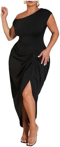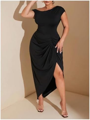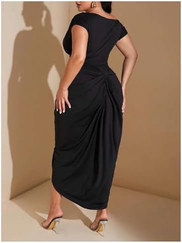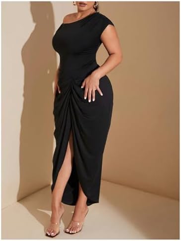 Floerns Womens Plus Size Asymmetrical Neck Long Dress Ruched Slit Hem Cocktail Dress
