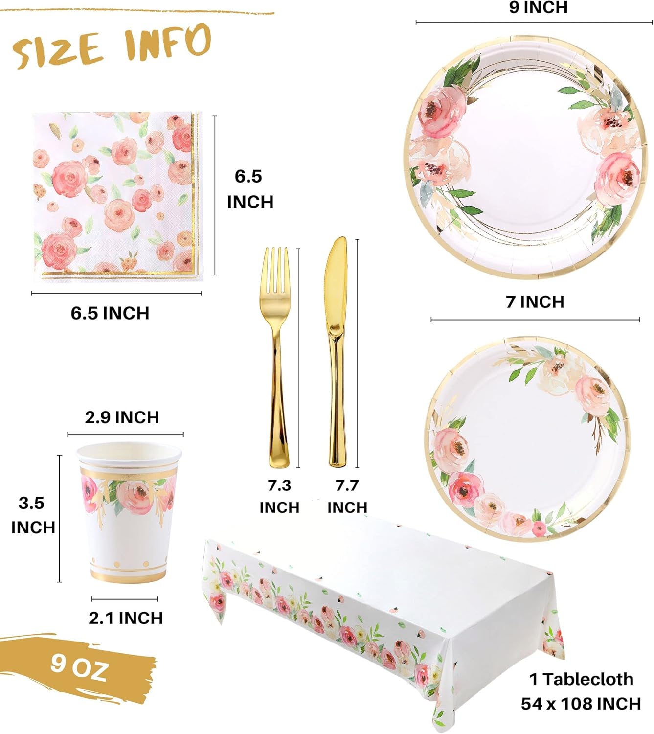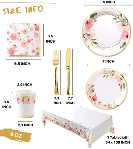 • 🌸 𝗦𝗘𝗥𝗩𝗘𝗦 𝟭𝟲 𝗚𝗨𝗘𝗦𝗧𝗦: The party supply pack contains 16 of each of the following: 9 inch paper plates, 7 inch paper plates, paper napkins (6.5 x 6.5 inch folded), 9oz paper cups, knifes, forks, and tablecloth.