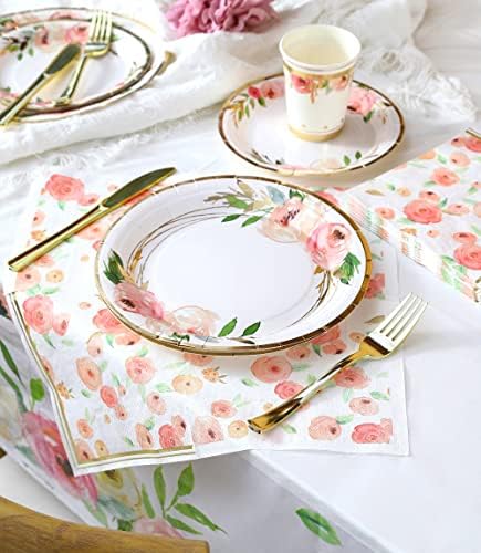 Floral Paper Plates and Napkins Party Supplies – Serves 16 – Flower Plates Floral Cups Knifes Forks Baby Shower Decorations for Girl Pink and Gold Bridal Shower Tea Party Birthday
