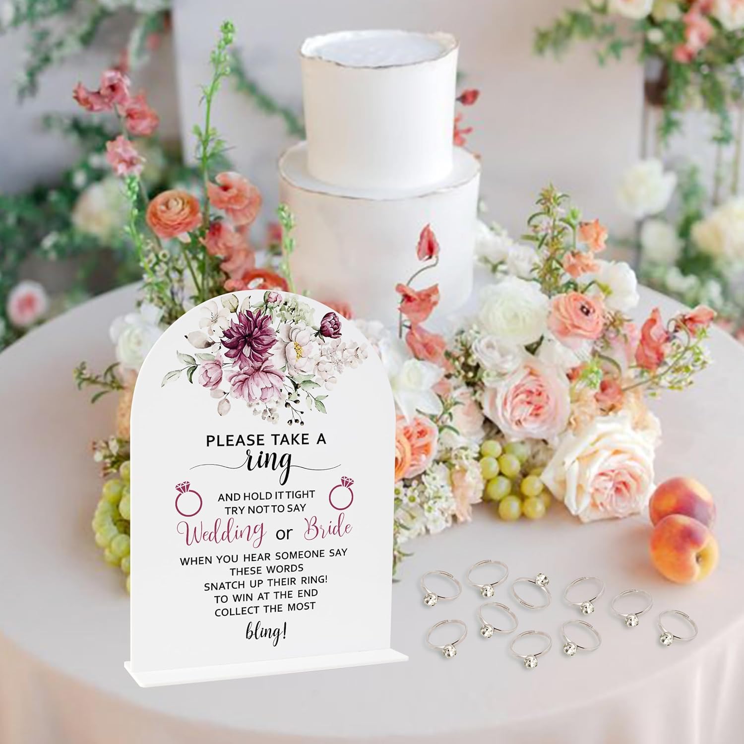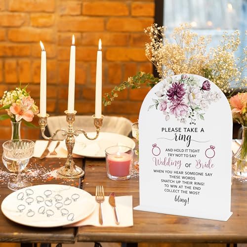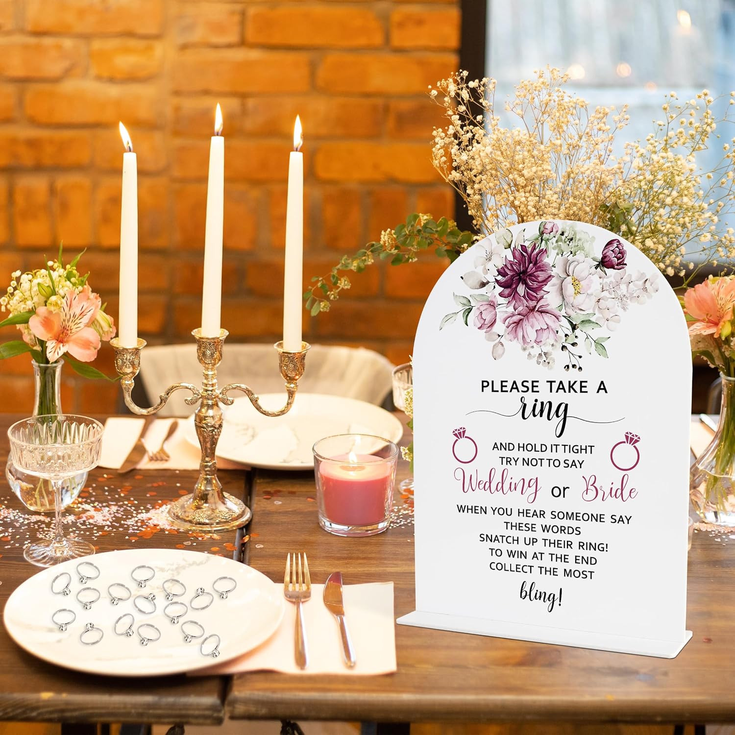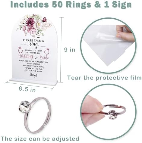 - This bridal shower game includes 1 acrylic sign 6.5×9 inch and 50 metal rings to get family and friends to participate in the fun game.