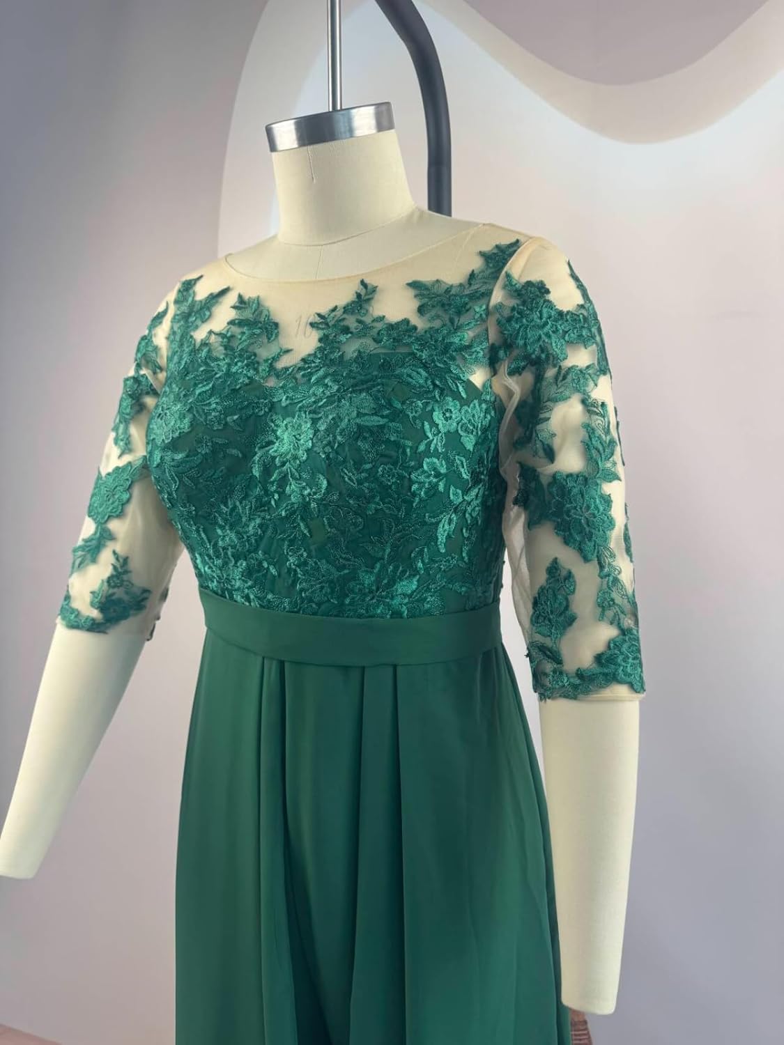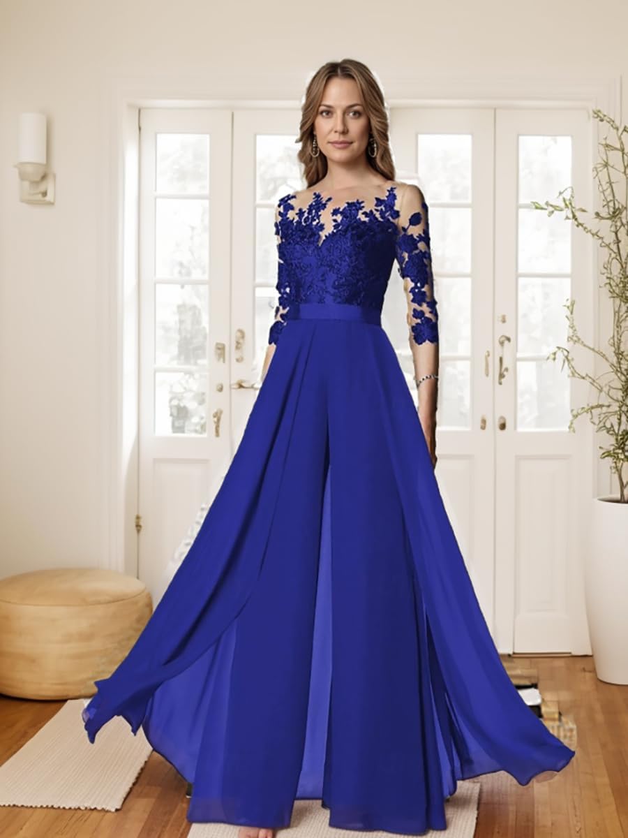 - FEATURES:2-Piece,Jumpsuit with skirt train,The upper body is made of skin tulle and hand-stitched with beautiful appliques,3/4 long sleeves,Scoop neckline,Built in bra,Elegant and classic,Combination zipper and button closure at back,Floor length,Elegant and classy for women