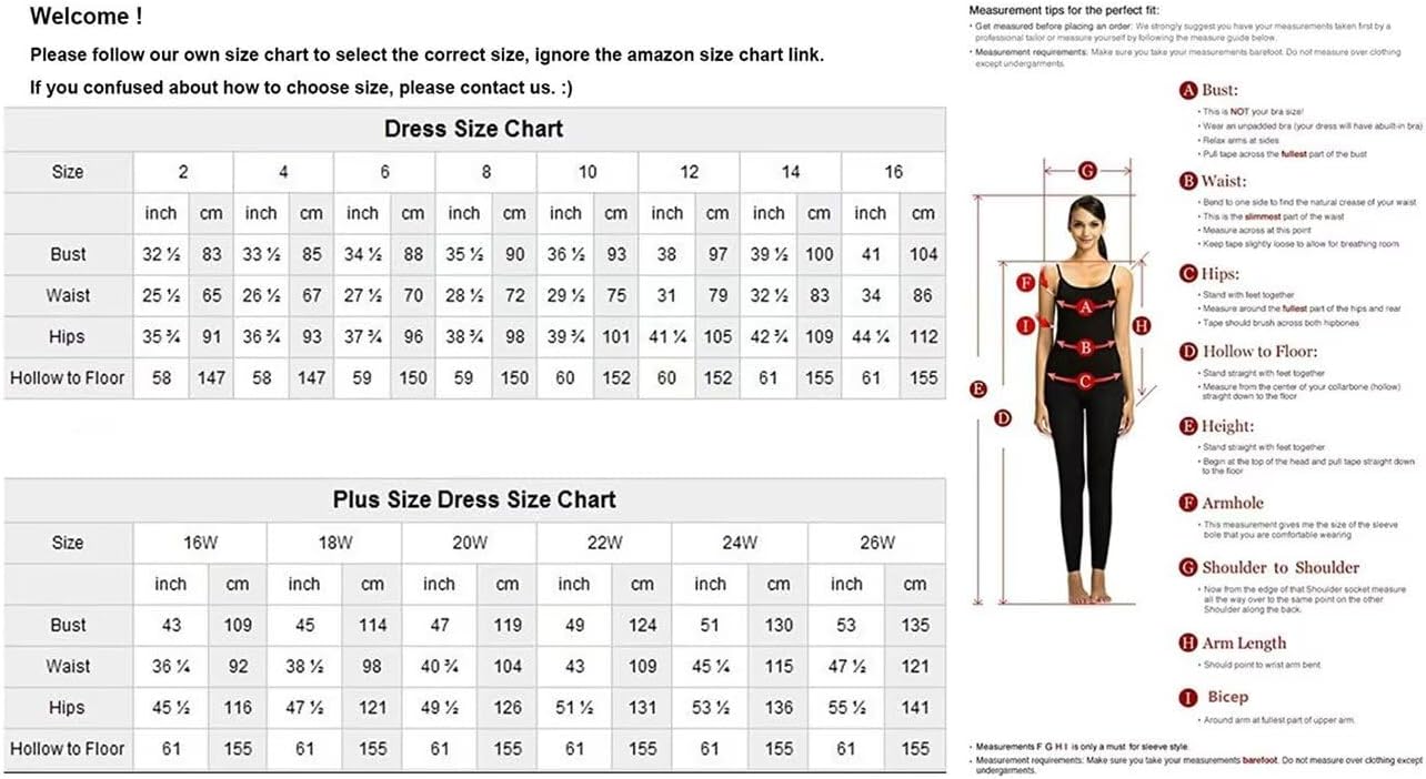 - Size:We have our own size chart,which is slightly different from Amazon’s.When placing an order,please compare the size you measure with the size chart provided by us and choose the size suitable for you.If you feel there is something that needs to be altered after comparing,you can send us your detailed measurements,we can make adjustments and alterations for you according to your measurements during the production to ensure that the dress can fit better.