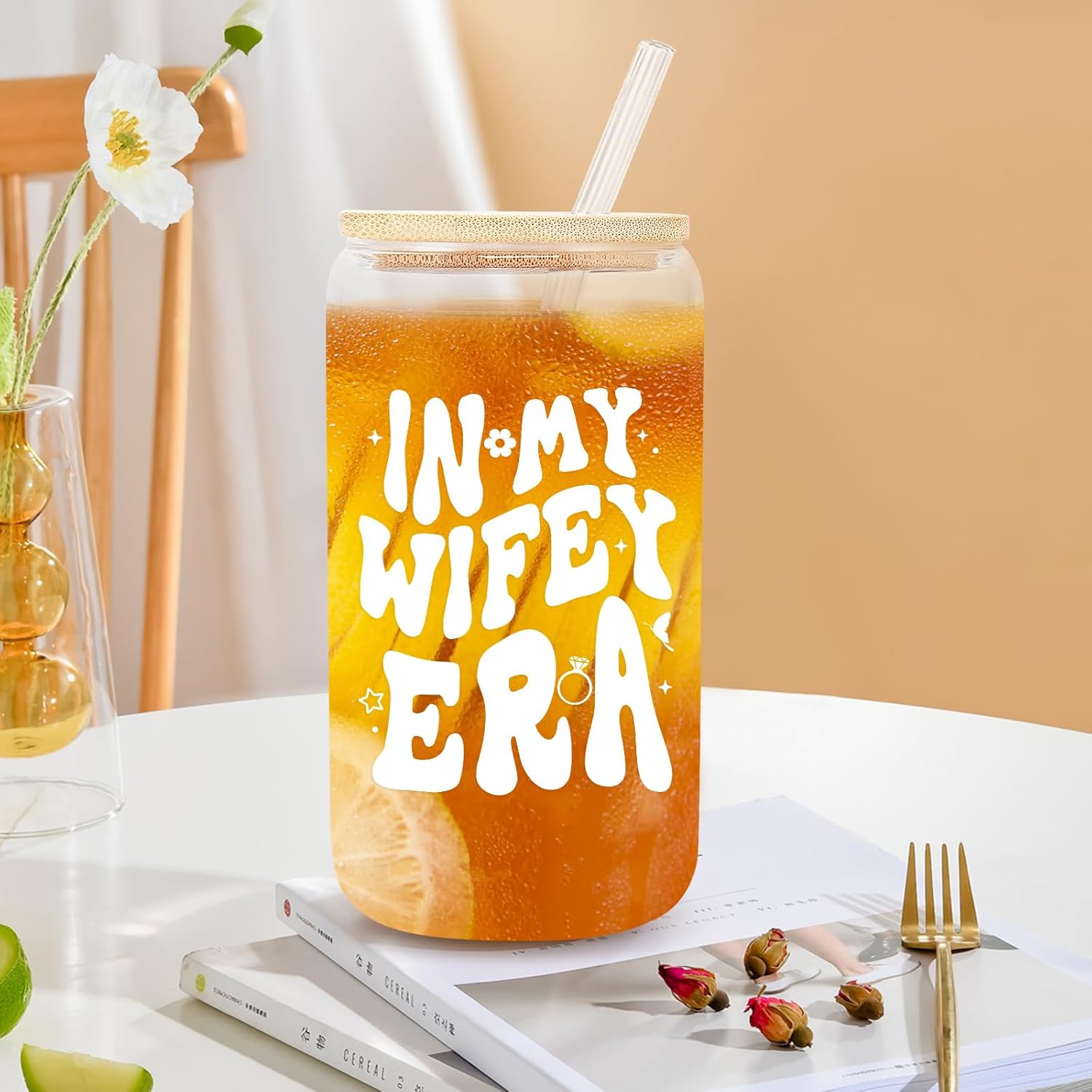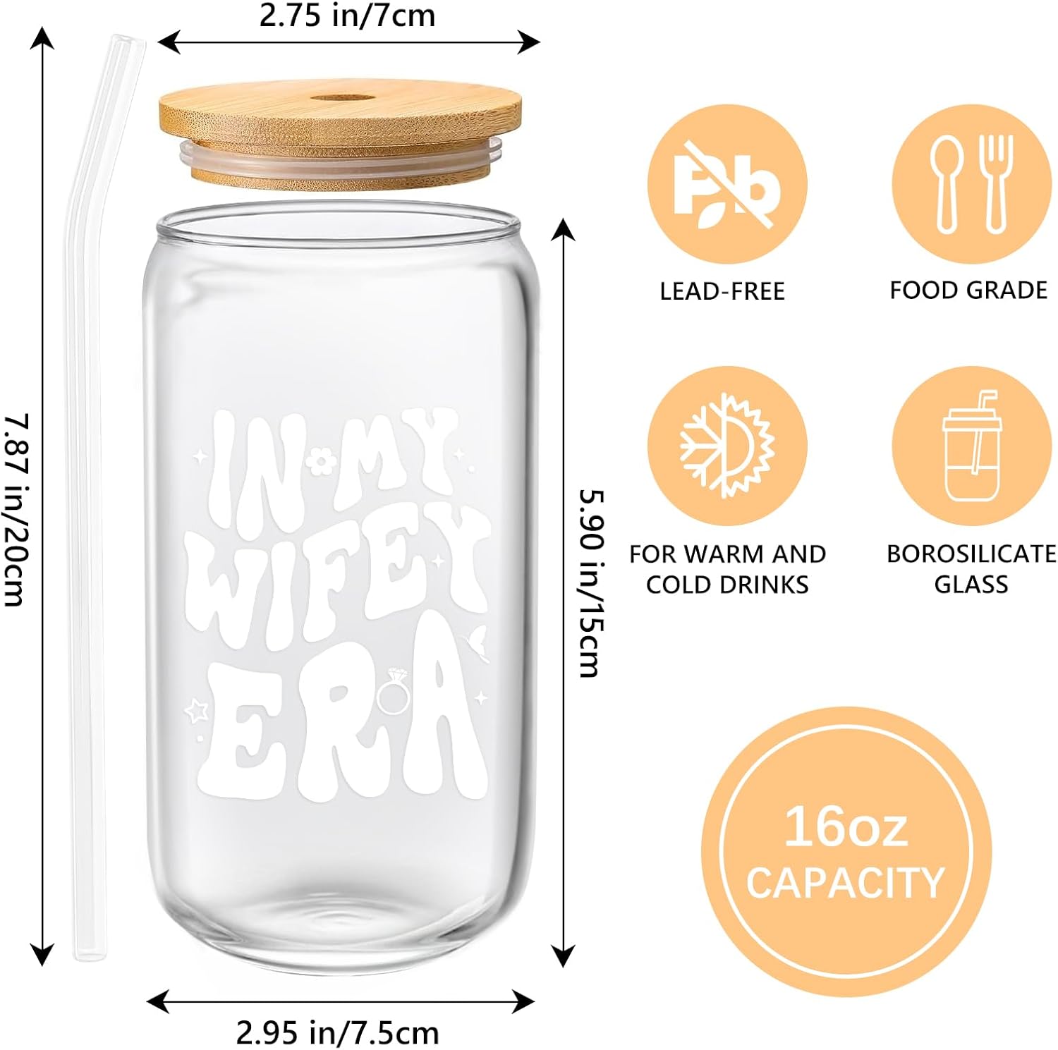 - Practical & Portable: This cup capacity is 16oz, measuring 2.76″ W and 6″ H. This wifey glass cup with lid and straw can easily fit into most cup holders, which is widely loved in office, homes, cafes, kitchens and bars. You can use it as aesthetic cup to make iced coffee, latte, cocktails, tea, morning coffee, smoothies, soda, beer, smoothies, juices, etc. Ideal for both cold and hot beverages. The can glass will be an extra surprise for a fan of home beverage making