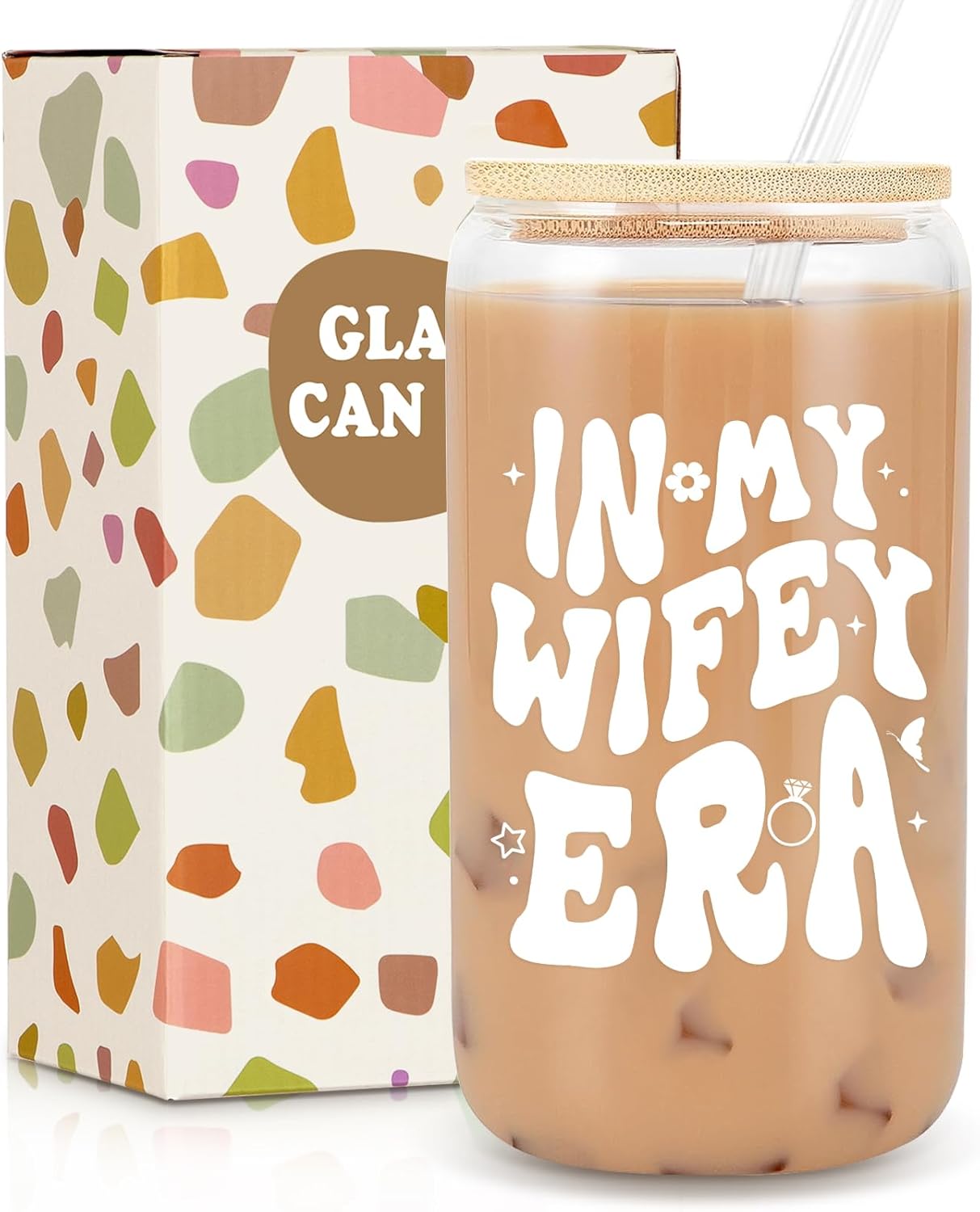 - Wifey Cup Gift Set: This wife gift includes 1 x 16oz can coffee glass cup, 1 x matching bamboo lid and 1 x reusable glass straw. Each bamboo lid comes with a sturdy silicone ring to avoid spilling. The firm seal of our reusable coffee cups with lids will keep your drinks safe whether you’re at home or on the go. Each bride cup is in thoughtful packaging, carefully packaged to ensure it arrives in perfect condition
