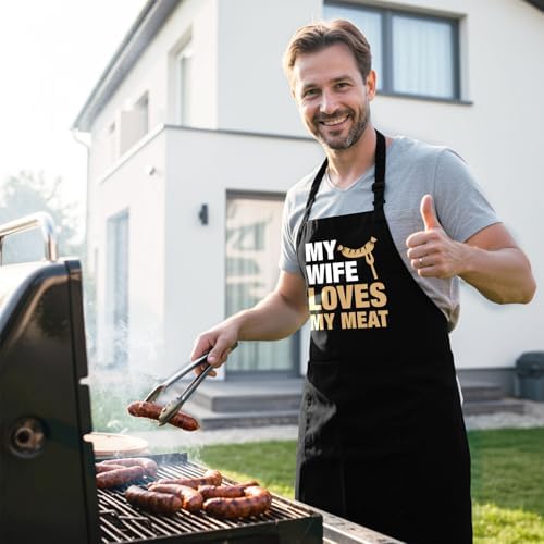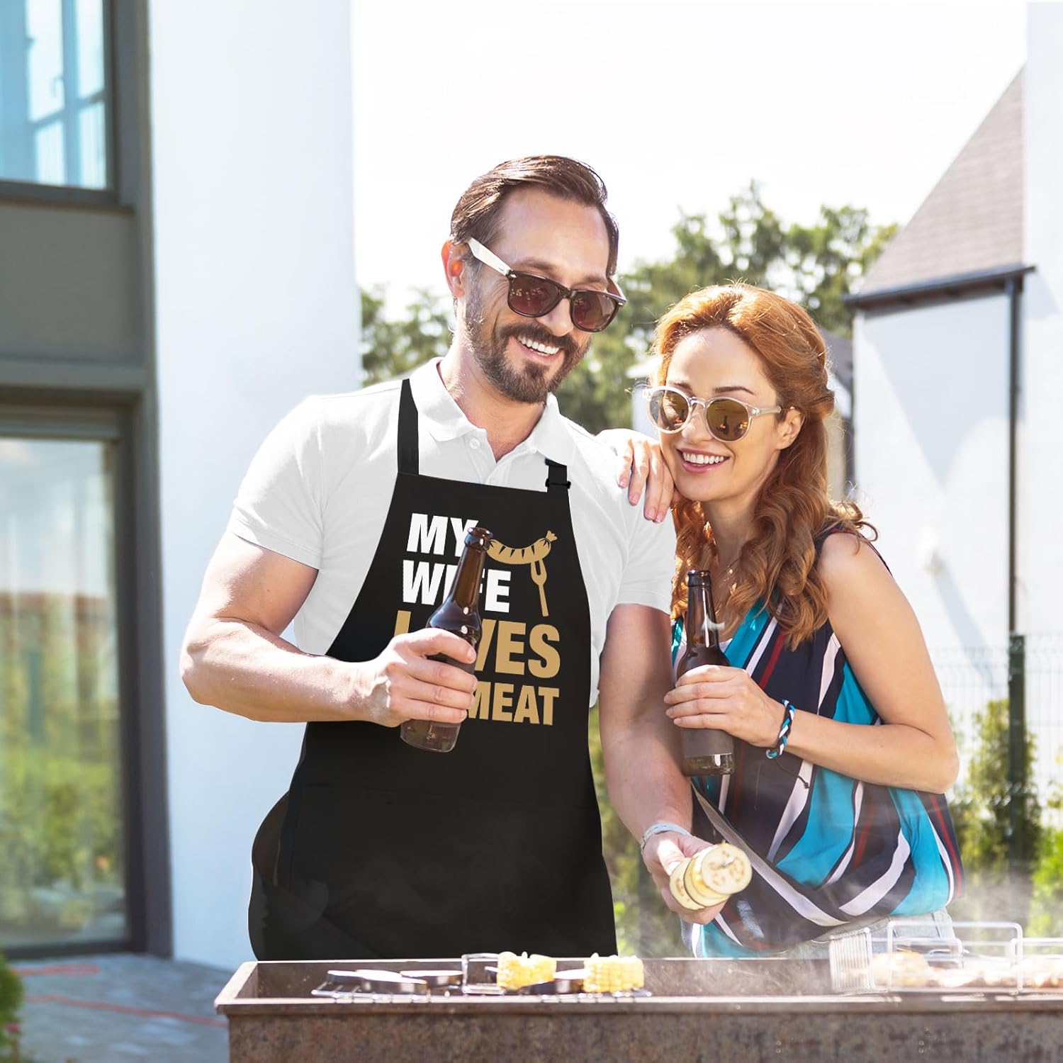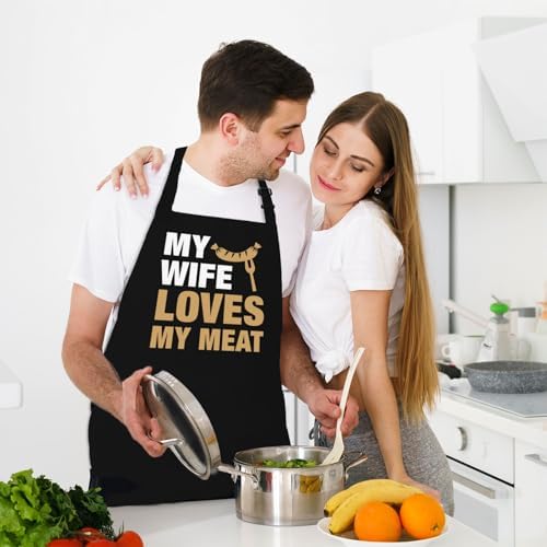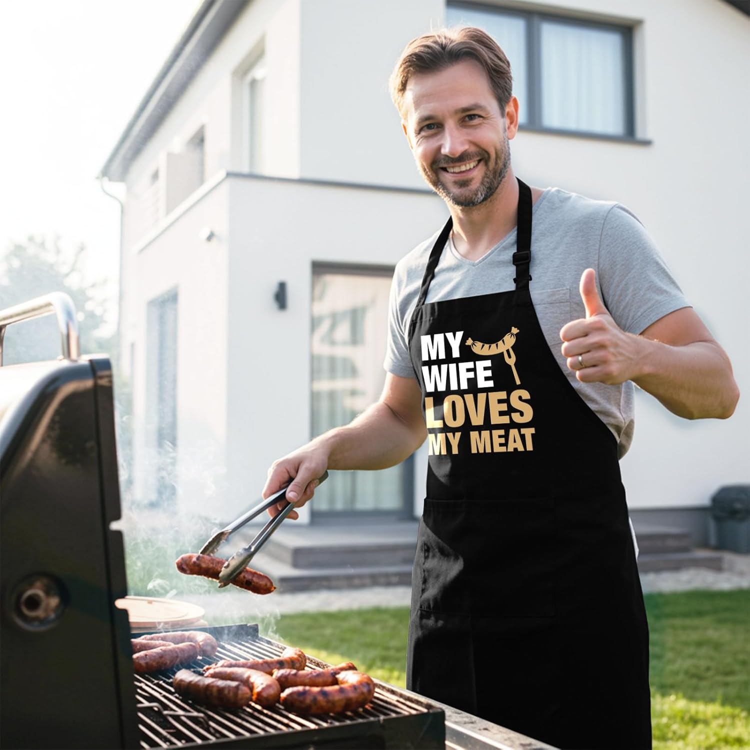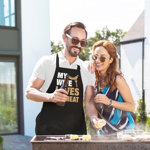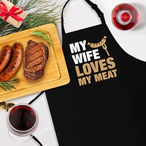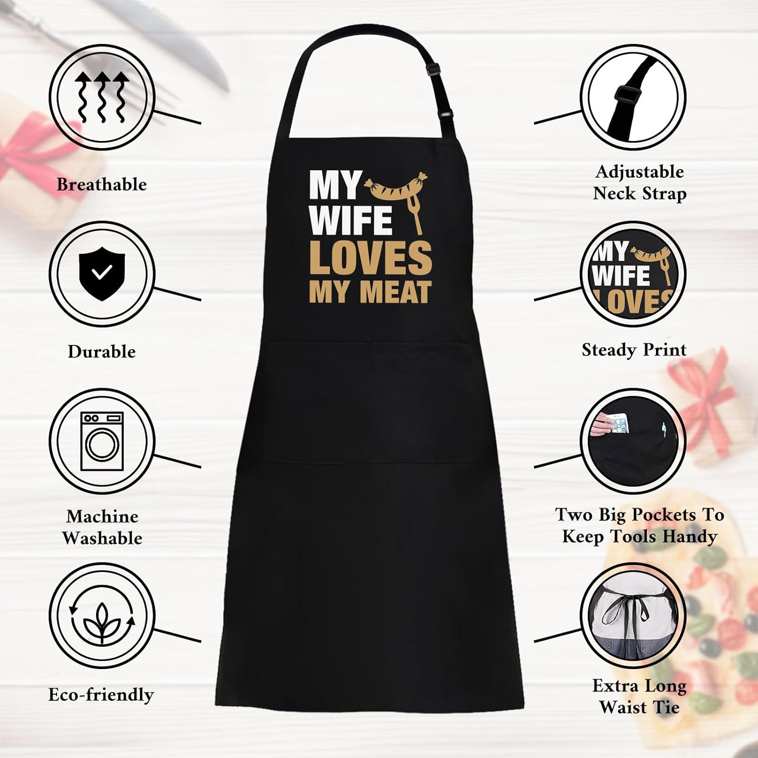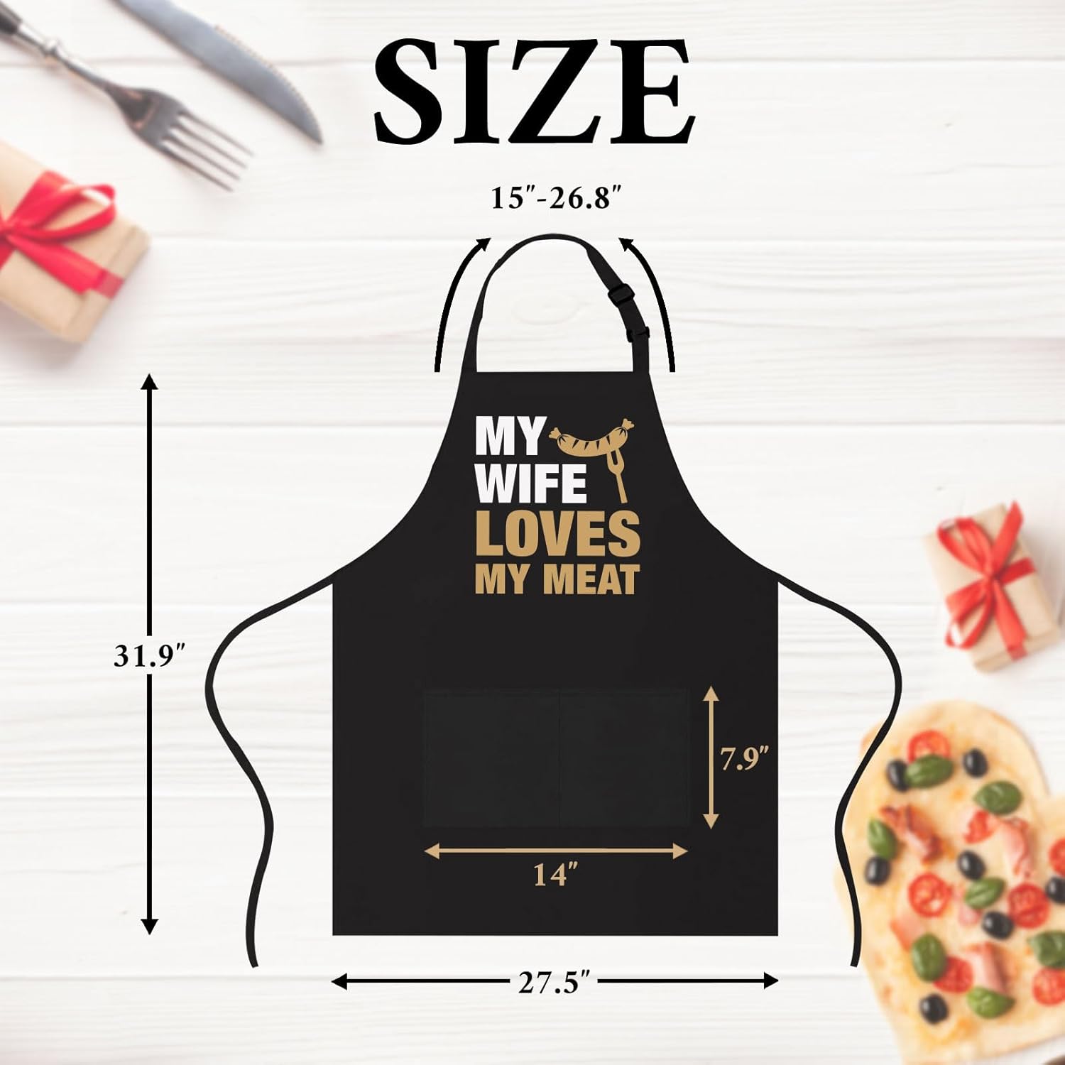 Funny Aprons for Men, My Wife Loves My Meat Apron, Birthday Gifts for Husband from Wife, Kitchen Cooking Aprons with 2 Pockets, Mens BBQ Grilling Apron, Anniversary Valentines Day Gift for Him