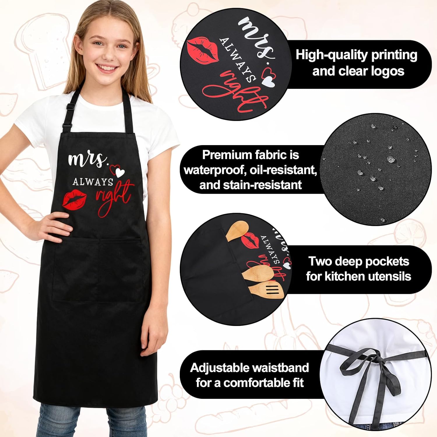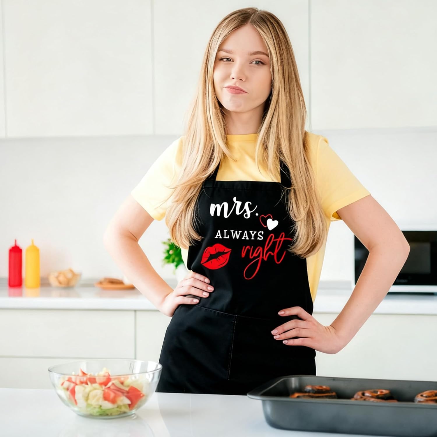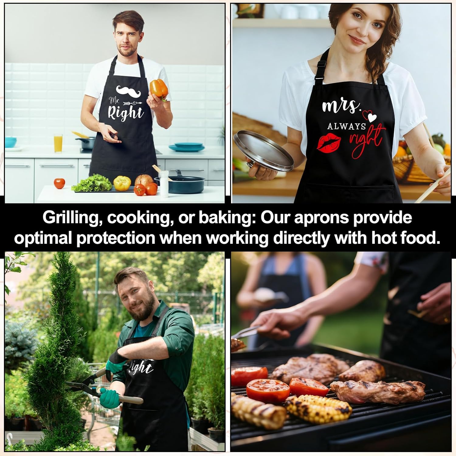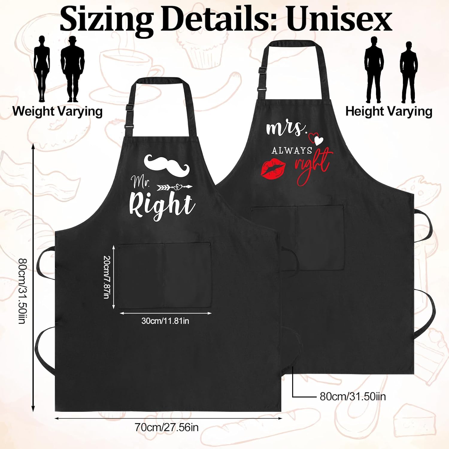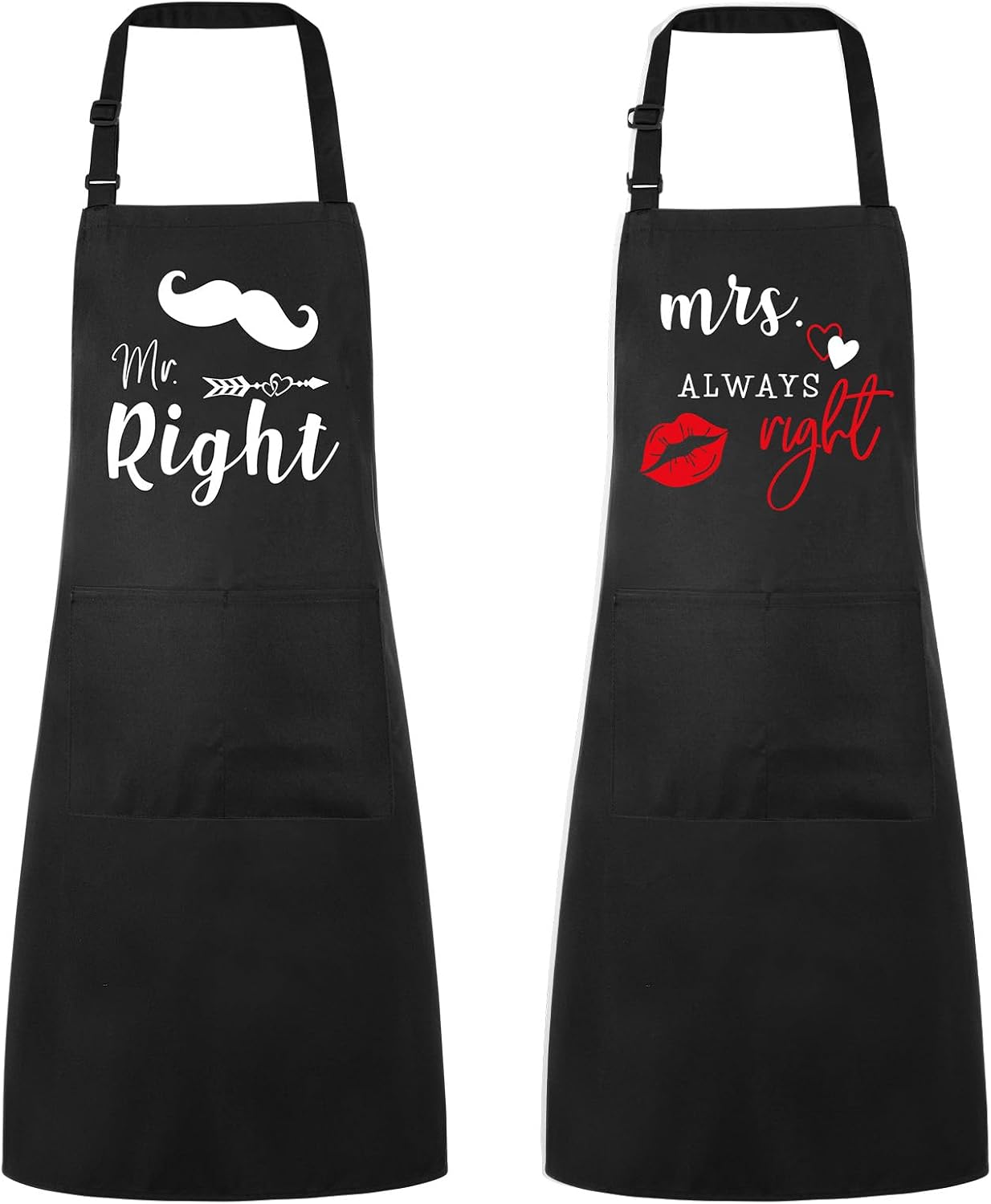 - Funny Couple Aprons: You will receive 2 pieces funny aprons for women and men; Features humorous text such as “Mr Righ” and “Mrs Always Right”; Specially designed for loving couples who love to cook together. Just add some fun and romance to life
