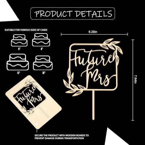 PRODUCT INFORMATION-” Future Mrs” Cake Topper that will be a great addition to your party. The natural bridal shower cake topper will create a warm and natural party atmosphere, perfect for wedding engagement theme party, bridal shower theme party. your cake will be look beautiful and elegant.-Suitable for many occasions : Bridal Shower Decor, Bridal Cake Topper, Future Mrs, Wedding Cake Topper, Bachelorette Party Decor, perfect for decorating cupcake cake dessert or other pastry.and you can also use them for ice cream, fruits, and other desserts.-PACKAGING and Material:High quality wood.Made of high quality eco-friendly wood products,not easy to deform and fade,smooth edges without burrs. ABOUT PRODUCT ATTRIBUTES AND DIMENSIONS-Size: Approx. 6.0 x9.2 inches, perfect for cakes various sizes .It can be used directly on the cake.you can adjust the inserting depth of it to adjust the height of cake topper.-Tips:This is not edible, only for decorate, please do not use it in the oven or microwave.WE ARE HAPPY TO CUSTOM DESIGN ANYTHING YOU NEED.If you have any questions or suggestions, PLEASE SEND US A MESSAGE!we will try best to serve you. We’d be super excited if you shared some happy photos with us in the comments!