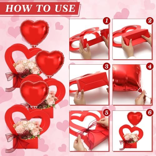 Features: Convenient Set: 20 sets heart flower gift boxes, equipped with foil balloons, balloon sticks and ribbon, nice floral or party favor arrangements for assorted occasions Practical Supplies: Hollow heart handle is aesthetic and portable, easy to assemble and store, practical for valentines day, mothers day, wedding, engagement and more other special events Specifications: Material: paper, aluminum foil Package includes: 20 x Heart Flower Gift Bag 20 x Heart Balloon 20 x Balloon Stick 2 x Ribbon Roll