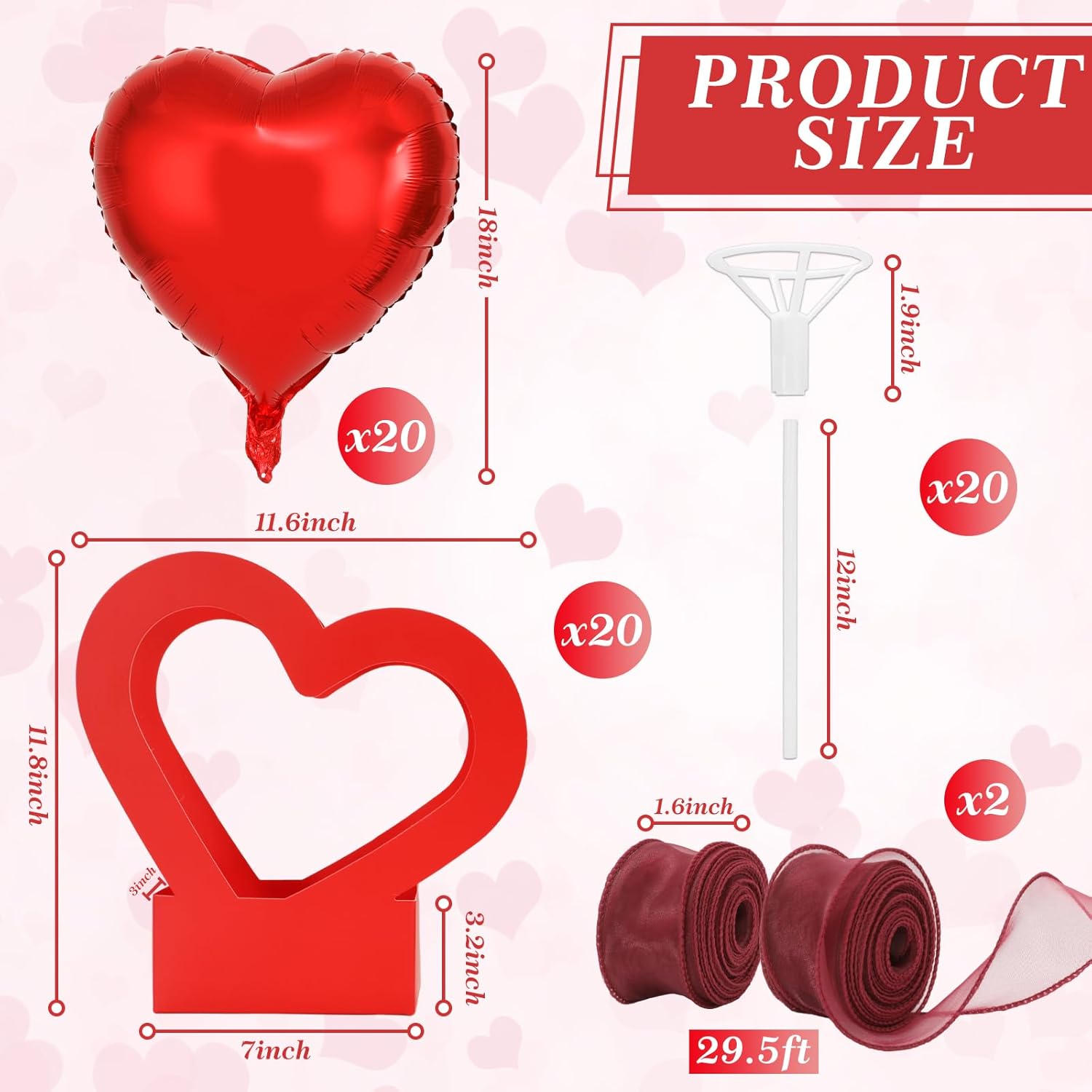 - SIZE DETAILS: Box: the bottom rectangle part is about 7 x 3 x 3.1 inch and the overall size with heart is about 11.8 x 11.6 x 3 inch, they can be unfolded for space-saving storage when not being used ; Balloon: 18 inch; Balloon holder: total length is about 16.9 inch; Ribbon: 1.6 inch x 29.5 ft