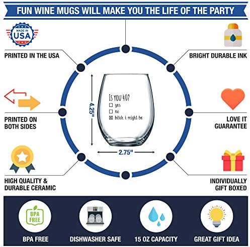 - UNIQUE GIFT FUN PARTY FAVORS AND DECORATIONS: This beautiful novelty wine glass is the perfect gift to WOW your guests and friends, whether it’s for a milestone 40th birthday party, class reunion or 40th wedding anniversary. Everyone will be thrilled to drink their favorite wine in this limited edition wine glass for years to come. Buy them in sets of 2, 4, 6, 12 or even more to make your next event truly memorable.
