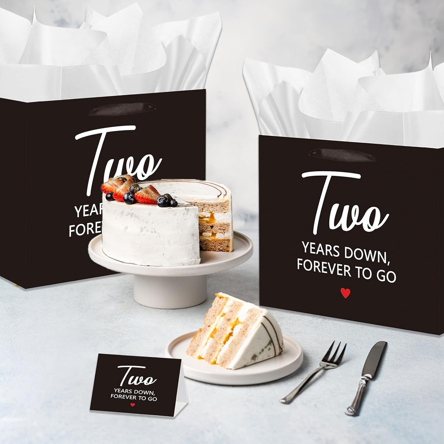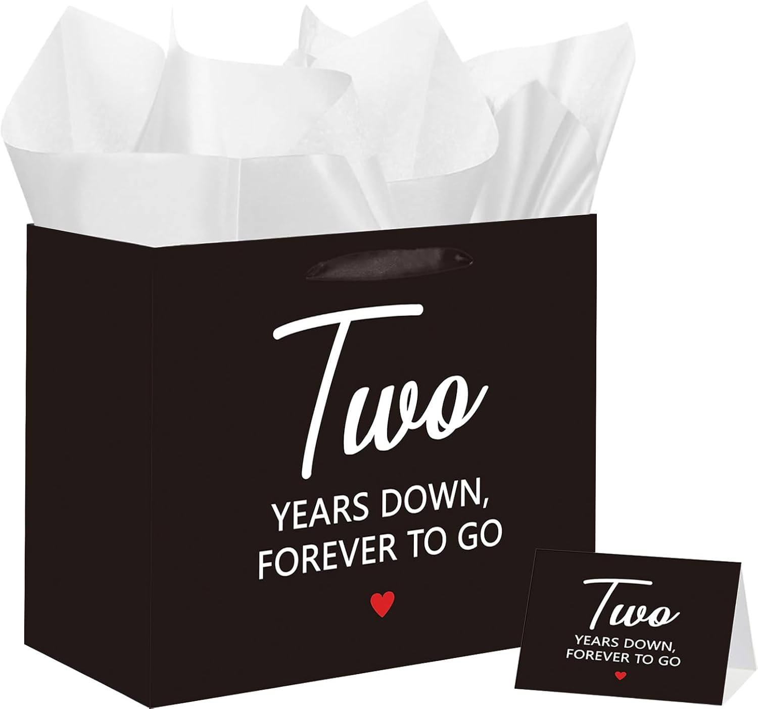 “Celebrate your love story with this elegant 2nd Anniversary Gift Bag Set, designed to make your special milestone unforgettable. The complete package includes: 1 Large Black Gift Bag (11.8″” x 5.31″” x 9.37″”) 1 Matching Greeting Card with Envelope (7.1″” x 4.7″”) 3 White Tissue Papers Key Features: Meaningful Design: Features the romantic phrase “”Two Years Down, Forever To Go”” in crisp white lettering Premium Quality: Made from durable, large paper material that maintains its shape Thoughtful Size: Large enough for jewelry, books, or sentimental keepsakes Complete Set: Includes everything needed for beautiful gift presentation Versatile Use: Great for various romantic celebrations Ideal For: 2nd wedding anniversaries Dating anniversaries Moving-in-together celebrations Valentine’s Day surprises Relationship milestones Why You’ll Love It: This sophisticated 2nd anniversary gift bag set helps you: Create memorable gift presentations Celebrate important relationship milestones Show your love with thoughtful packaging Maintain an elegant, unified gift presentation Set Includes: 1 Black Anniversary Gift Bag 1 Greeting Card with Envelope 3 White Tissue Papers”