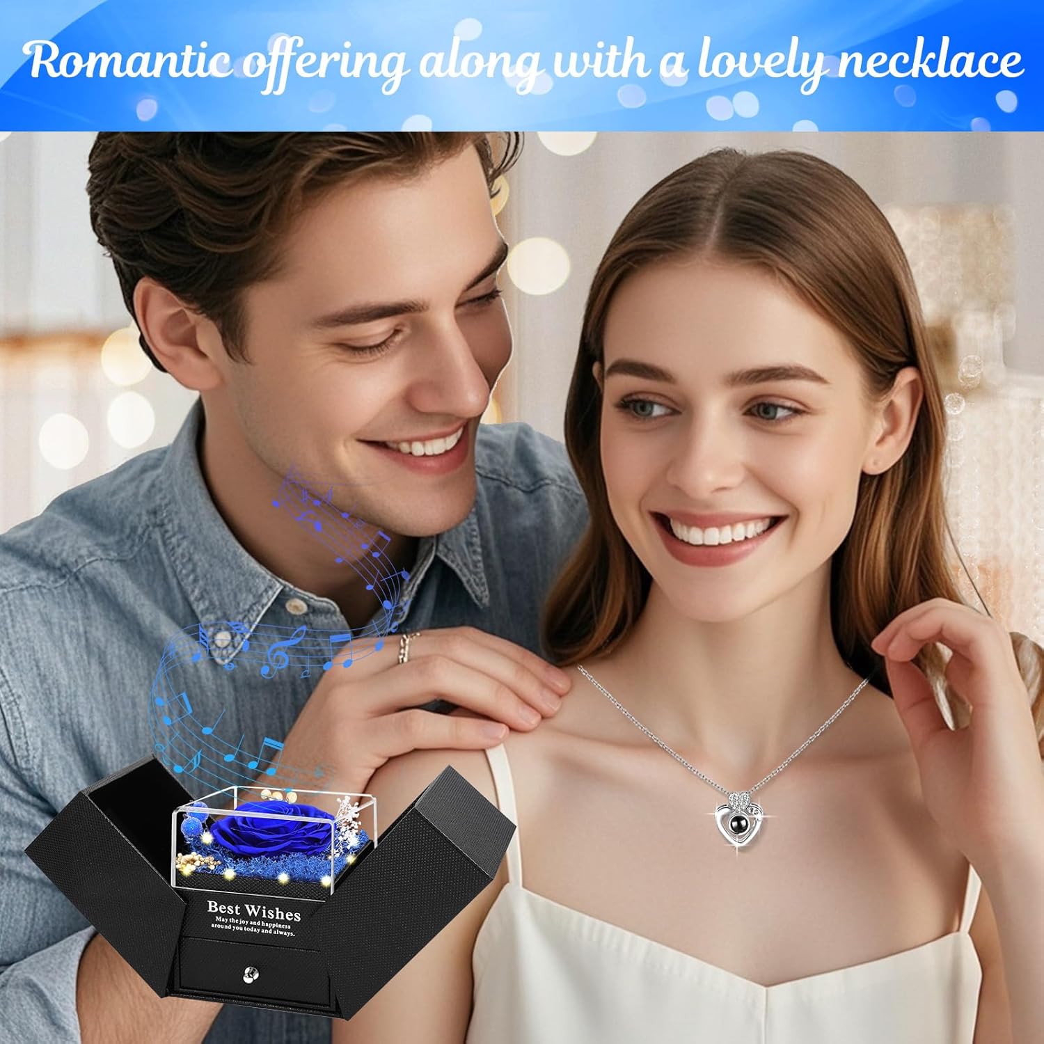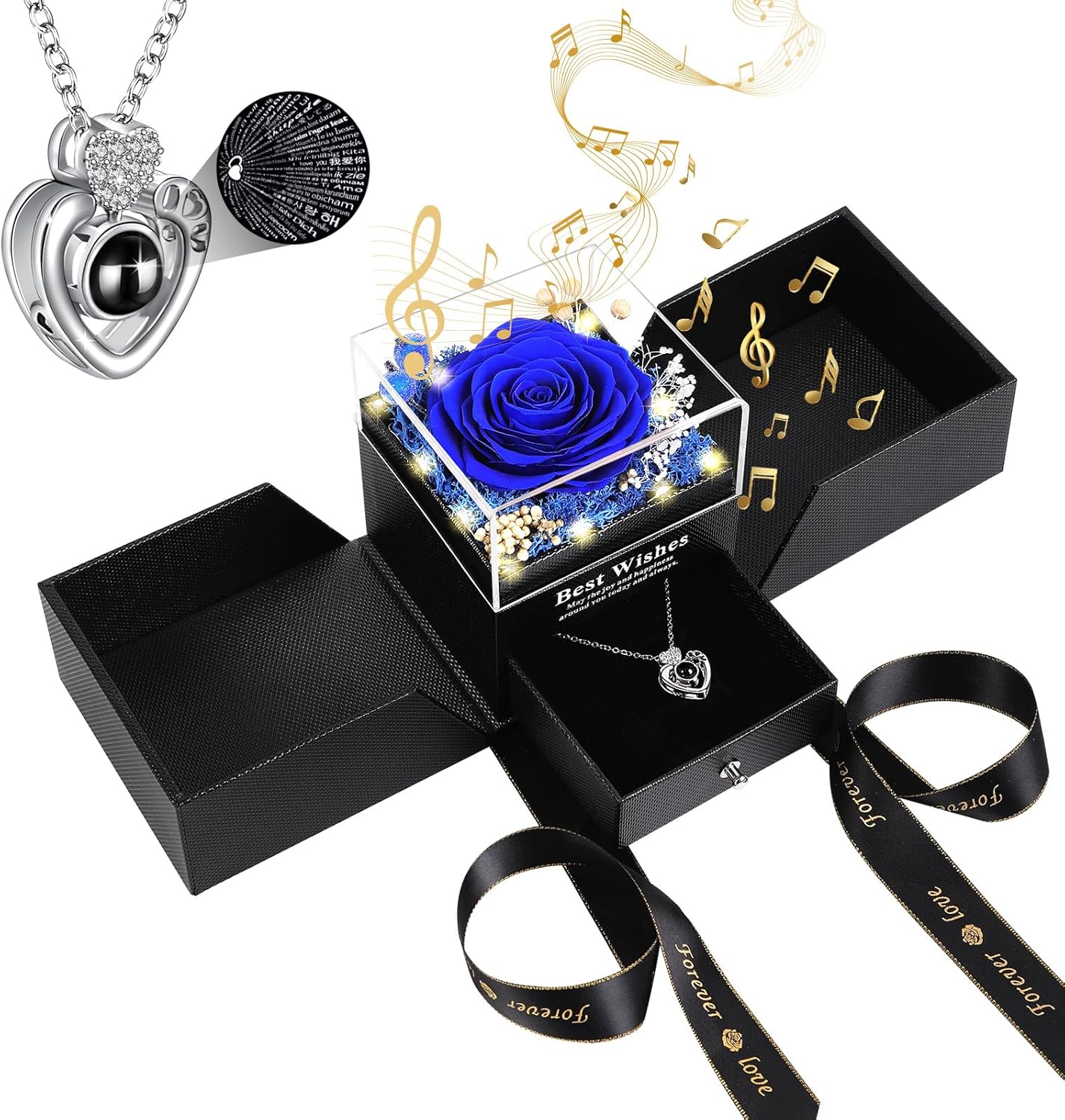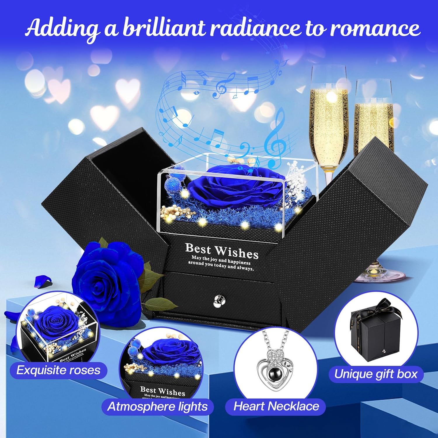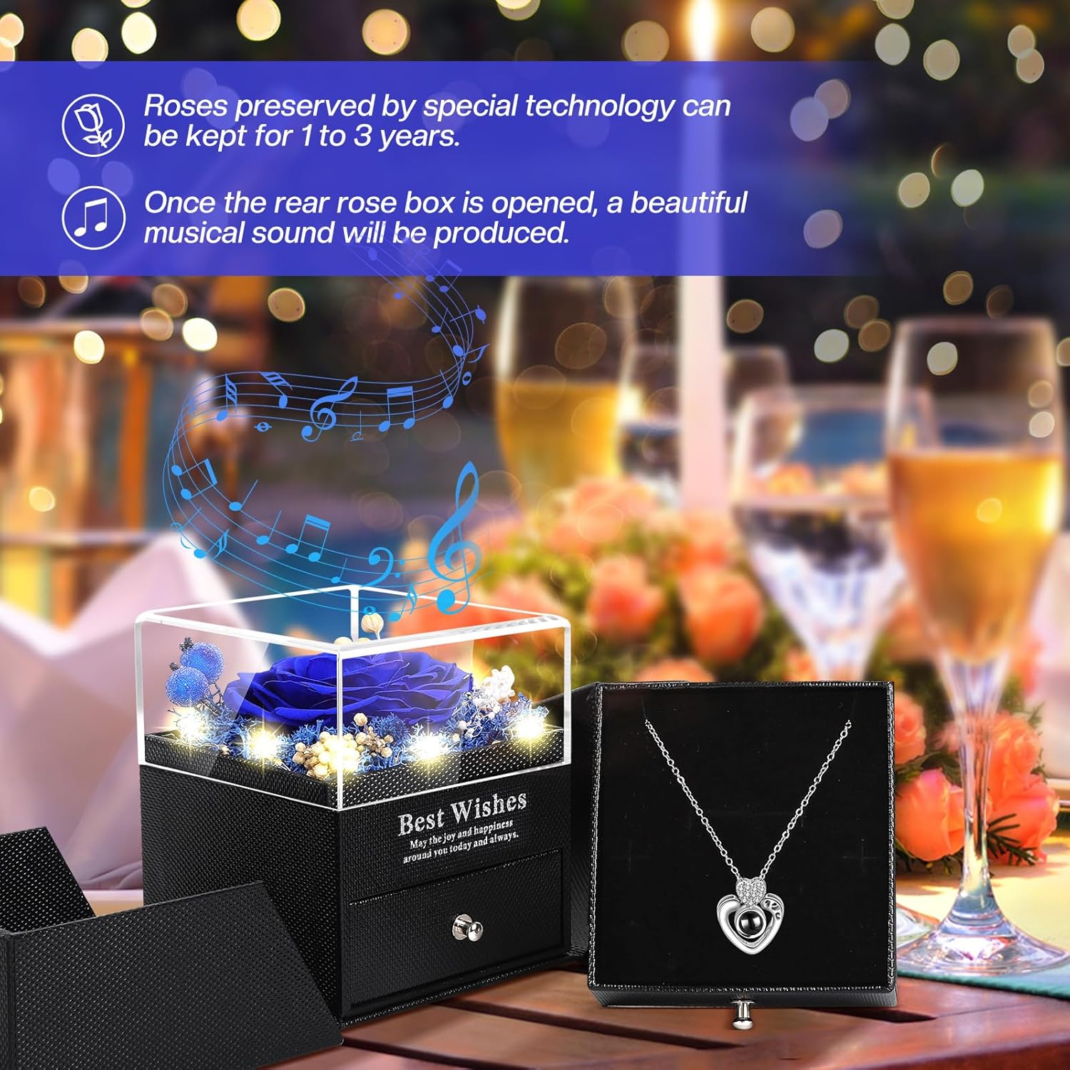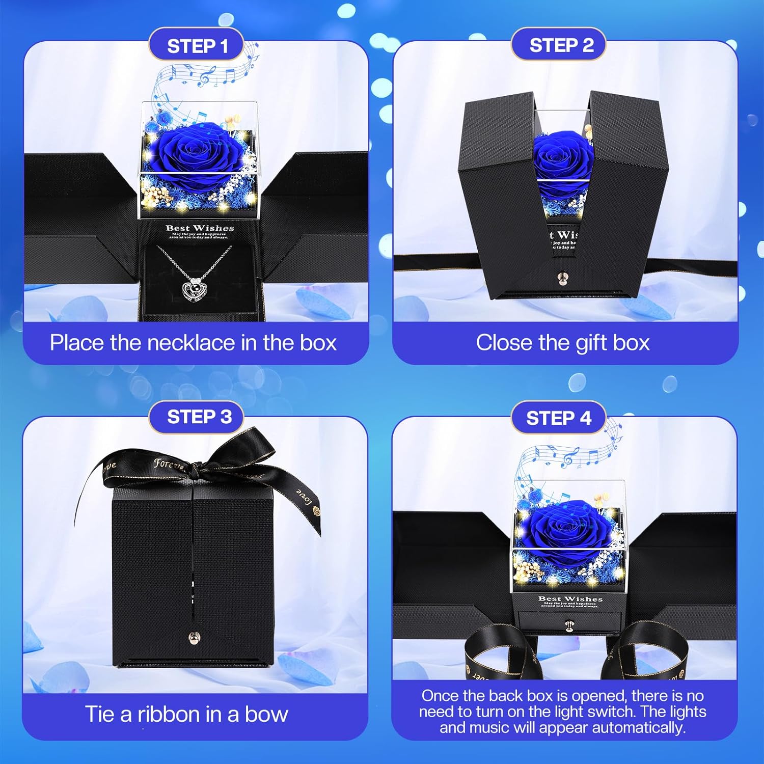 • Magical Light & Music Experience: Enhance the romantic gesture with our exquisite music box. When opened, integrated lights illuminate the stunning rose while soothing music plays, creating a magical atmosphere. With an automatic timer, the lights gently fade after five minutes, ensuring a captivating moment without manual intervention
