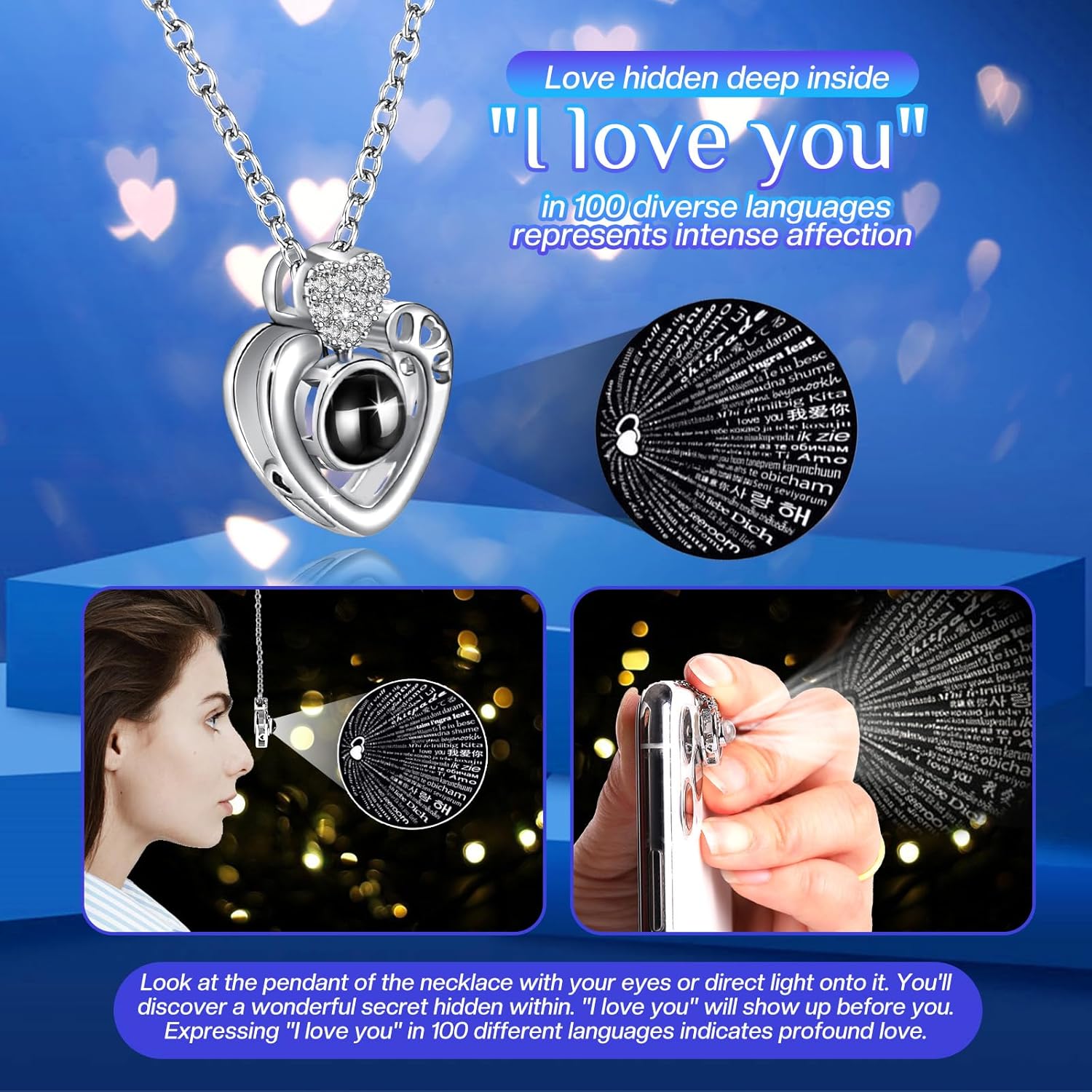 • “I Love You” in 100 Languages Gift with Necklace: Surprise gifts for her with a unique double heart-shaped necklace engraved with “I Love You” in 100 languages. This romantic piece is nestled at the bottom of the rose box, serving as a heartfelt token of your affection. The intertwined hearts symbolize unbreakable bonds, making it an exclusive gift for her