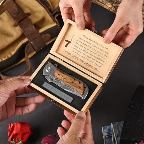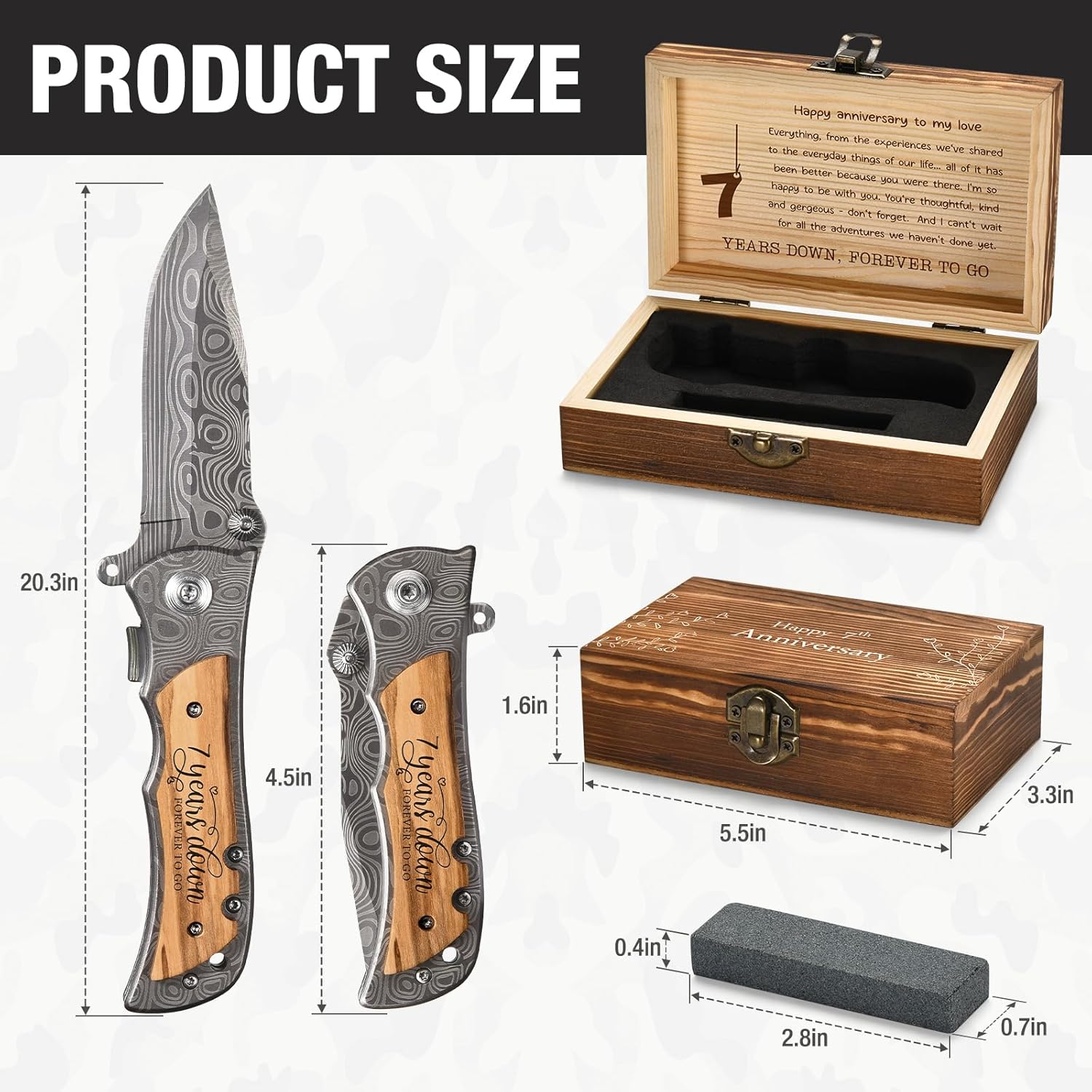 - Product details: Made of premium stainless steel and natural oliver wood, printed with: 7 YEAR DOWN, FOREVER TO GO