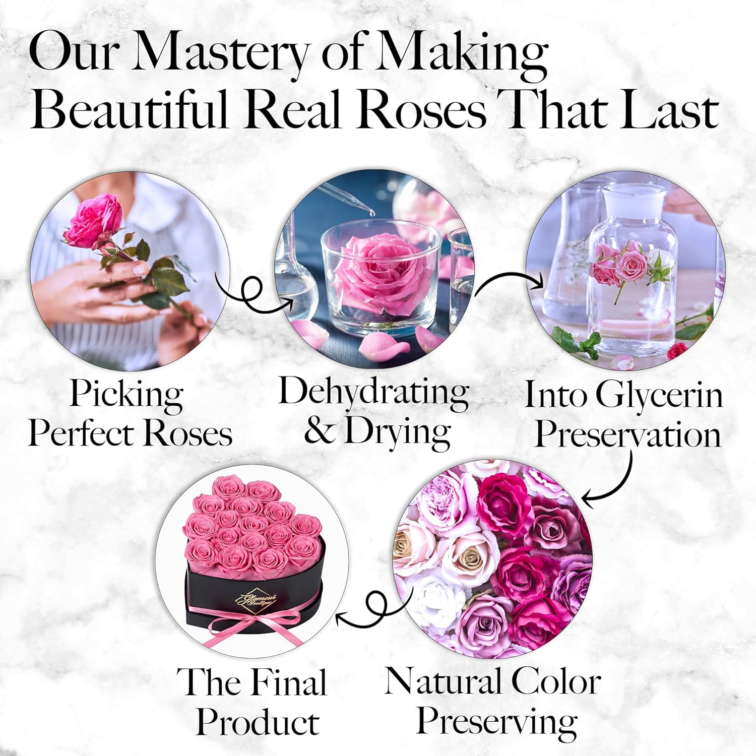 - An Exceptional Gift Idea – Delight your loved ones with GLAMOUR BOUTIQUE roses, a luxurious symbol of everlasting love. Ideal flowers roses eternal in a box for Valentine’s Day, Mother’s Day, weddings, anniversaries, birthdays, or as home decor.