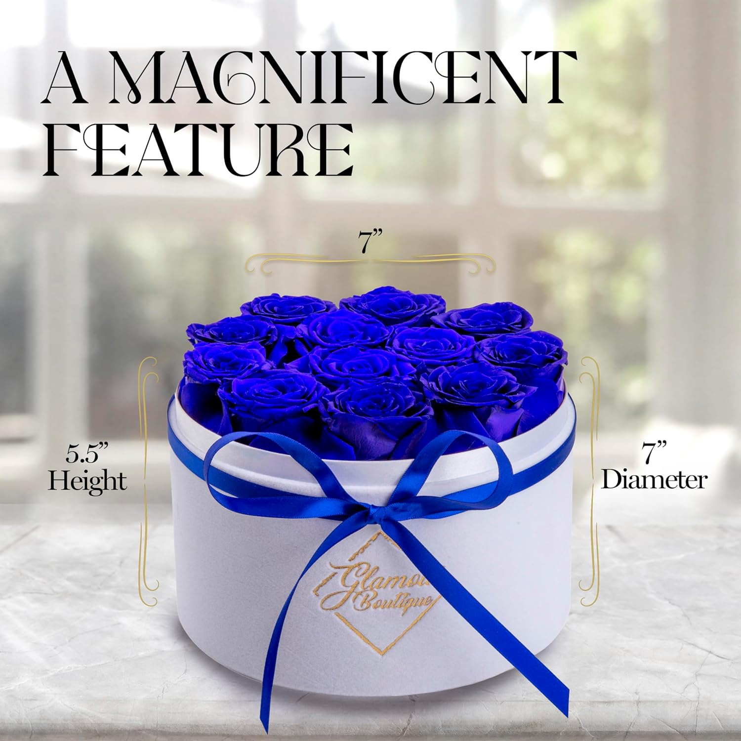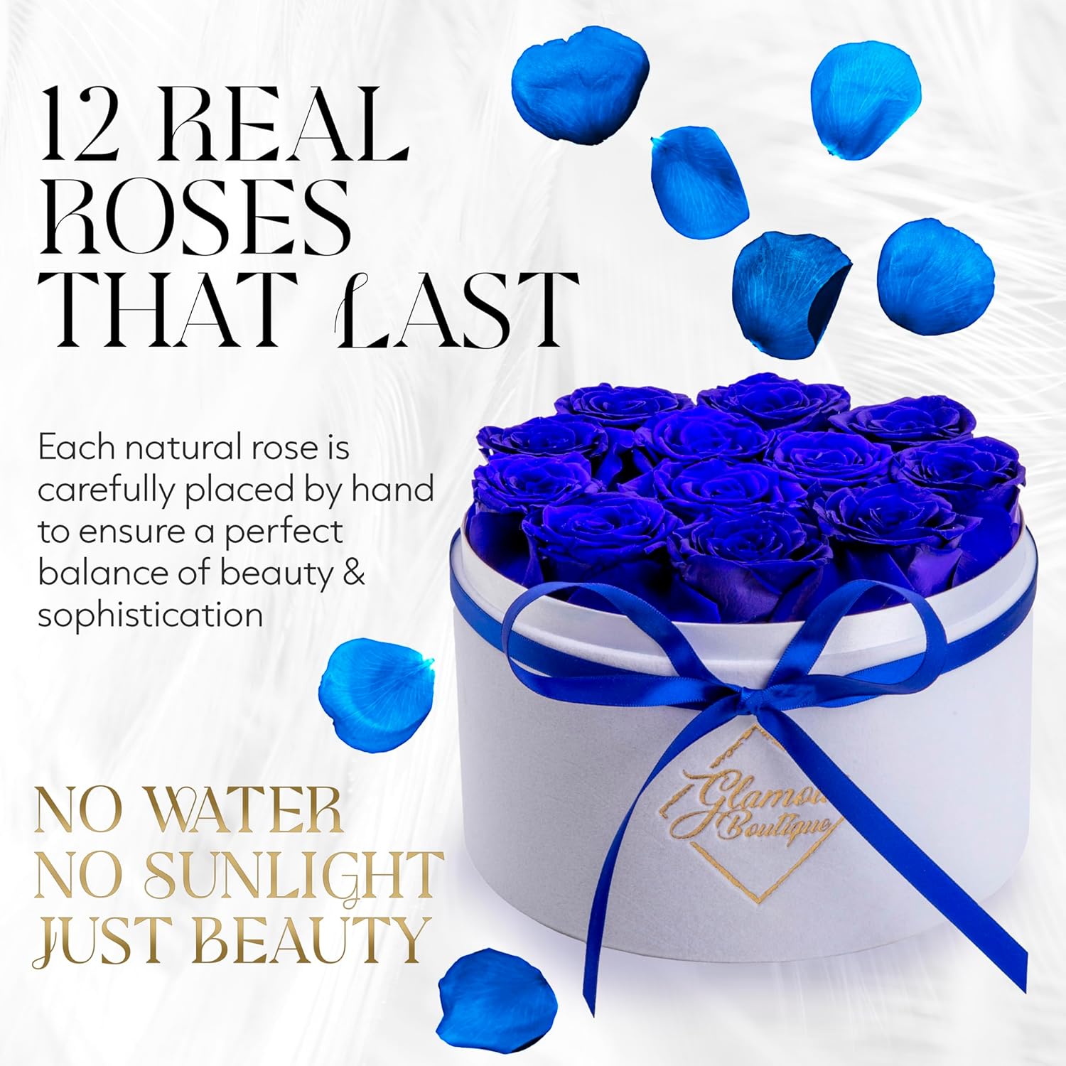 GLAMOUR BOUTIQUE Flower Forever Gift Box 12 Real Preserved Roses in Round Velvet White Box, Handmade, Rose Petals, Birthday, Marriage, Anniversary, Graduation – Blue