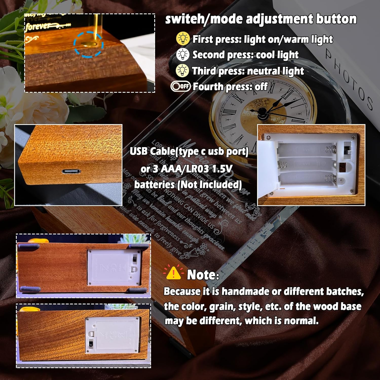- Elegant Design – If you look for a unique gift for the couples, our glass clock is a special choice. This quartz clock is elegantly designed and comes with premium wooden base. Soft lighting adds warmth to any space and is an ideal gift that combines functionality and fashion. Pious words can warm and move her/his heart. It will not fade or wither like flowers, symbolizing the eternal love of the couple