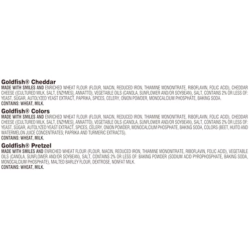 Product Description The irresistible little snack that always delights. This assortment of munchable, crunchable snack crackers includes Goldfish Cheddar, Goldfish Colors Cheddar and tasty Goldfish Pretzels. Goldfish Cheddar and Goldfish Colors Cheddar are baked with 100% Cheddar cheese. Goldfish Pretzels..