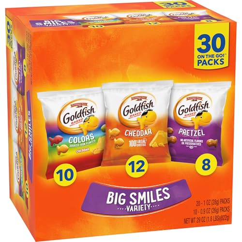 Product Description The irresistible little snack that always delights. This assortment of munchable, crunchable snack crackers includes Goldfish Cheddar, Goldfish Colors Cheddar and tasty Goldfish Pretzels. Goldfish Cheddar and Goldfish Colors Cheddar are baked with 100% Cheddar cheese. Goldfish Pretzels are crisp and delicious. All three flavors are always baked and made with no artificial flavors or preservatives. Talk about a feel-good snack. Goldfish snack crackers are great for lunch as well as snack-time munching. You can also add them to soups or add them as a side with your sandwich. Thats all it takes to whip up a meal thats tasty and fun. Kids and adults alike love Goldfish crackers, and being able to choose from their favorites is sure to be a big hit with everyone. With 30 single-serve Snack Packs, youve made the right choice for lunches, on-the-go snacking and sharing. Expect big smiles all around. Next time youre craving something delicious, go for the handful. From the Manufacturer New name, same great variety as the Classic Mix! With Goldfish crackers, the smiles come naturally. This Big Smiles variety pack of Goldfish goodness includes all your favorites in single-serving packs: Goldfish Colors (0.9 ounce each), Goldfish Cheddar (1 ounce each) and Goldfish Pretzel (1 ounce each). Always baked, never fried, Goldfish crackers are a snack the whole family will adore. All of our cheese cracker varieties, like cheddar, are baked with real cheese, and Goldfish crackers have no artificial flavors or preservatives, and use colors sourced from plants. This 30-count variety pack is great for on-the-go snacking with individual serving sizes. For Pepperidge Farm, baking is more than a job. It’s a real passion. Each day, the Pepperidge Farm bakers take the time to make every cookie, pastry, cracker and loaf of bread the best way they know how by using simple, quality ingredients.