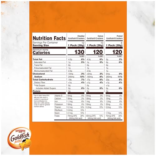 • Variety pack includes: 10 single-serving packs of Goldfish colors, 12 packs of Goldfish cheddar, 8 packs of Goldfish pretzels
