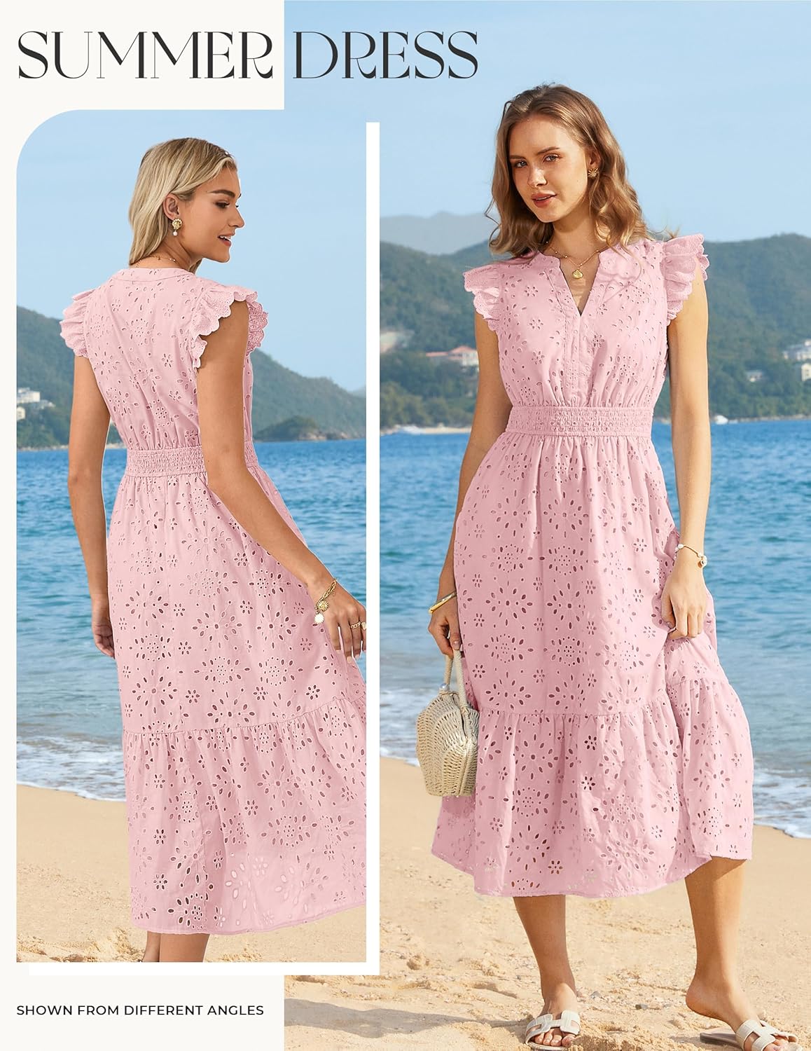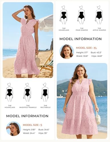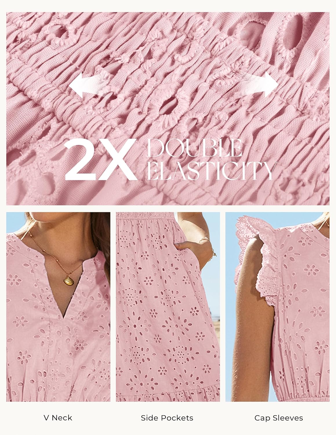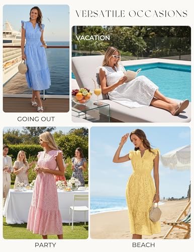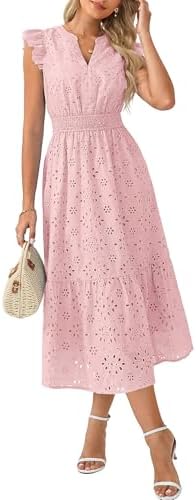 • Trendy Features: Flutter sleeves, notched V-neck, eyelet embroidered design, smocked elastic waist, two side pockets, and tiered A-line skirt—a figure-flattering silhouette that moves beautifully and stays comfortable