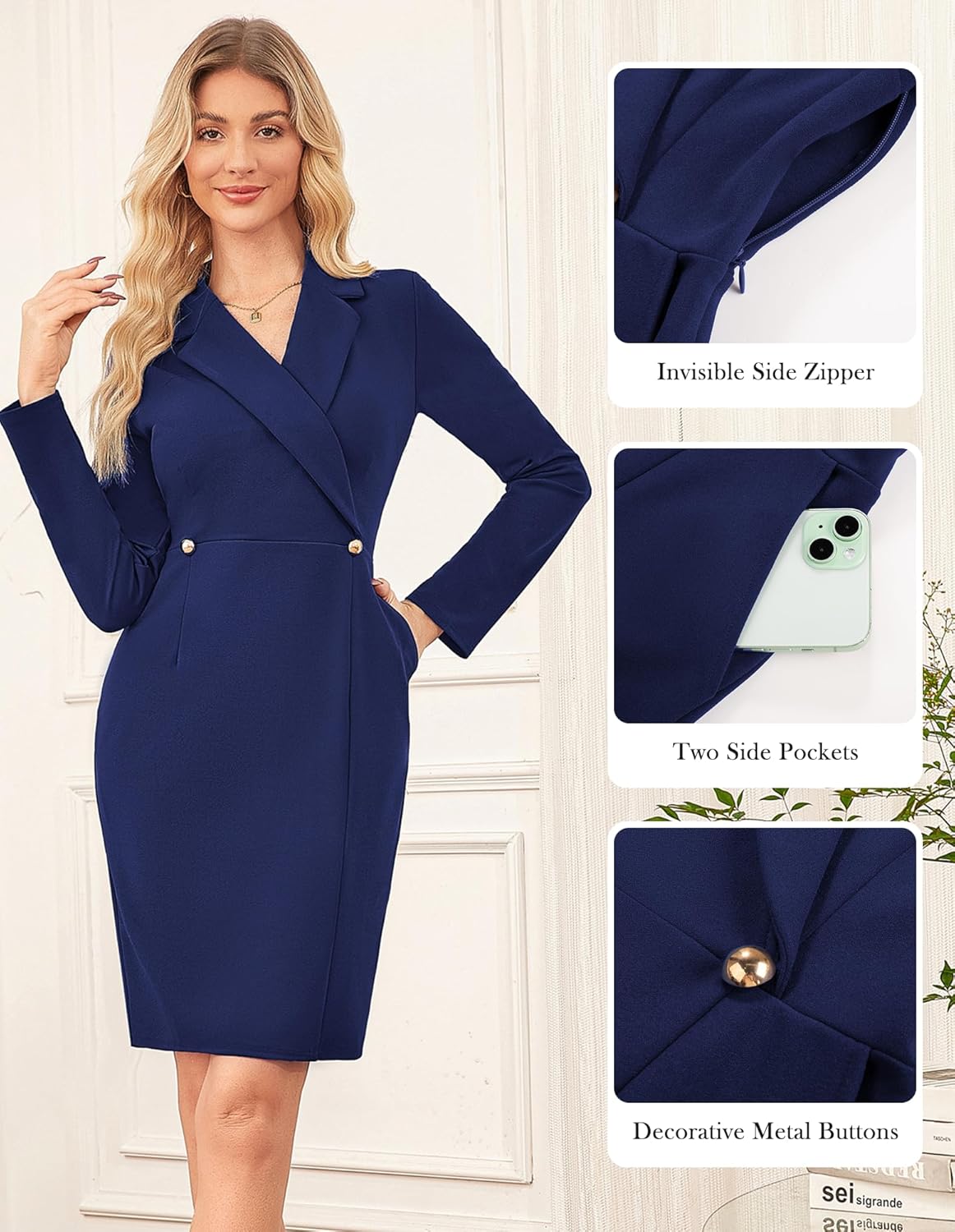 - Thoughtful Design Details: Features decorative metal buttons, hidden left-side zipper for smooth lines, functional side-seam pockets for essentials, and long sleeves that provide coverage while maintaining a sleek profile