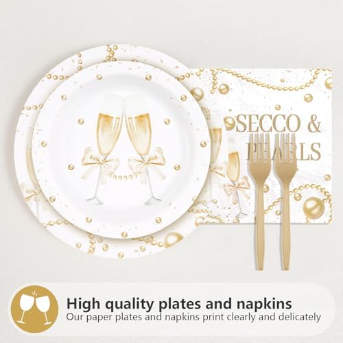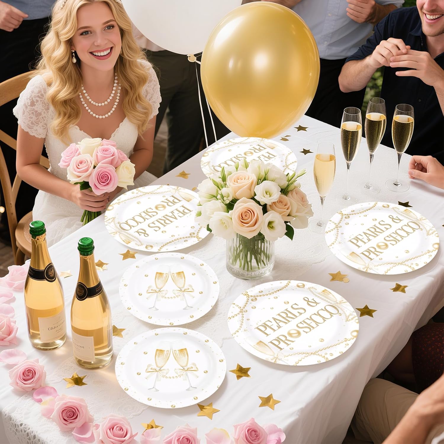 - Pearls and Champagne Bridal Shower Supplies: Our 96 pcs pearls and champagne tableware set includes 24 9″ dinner plates, 24 7″ dessert plates, 24 napkins and 24 forks for each set that can serve 24 guests. Designed for the bridal shower, this pearls and champagne decorative dinnerware provides the perfect party experience