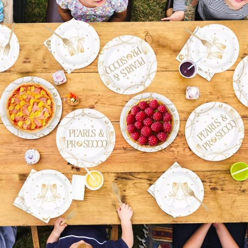 - Pearls and Champagne Bridal Shower Design: The bridal shower decorations tableware feature an elegant pearls and champagne design, designed to make your bridal shower extra special. It shows “Pearls & Prosecco” in delicate letters, adding a romantic and celebratory touch to this important bridal milestone celebration