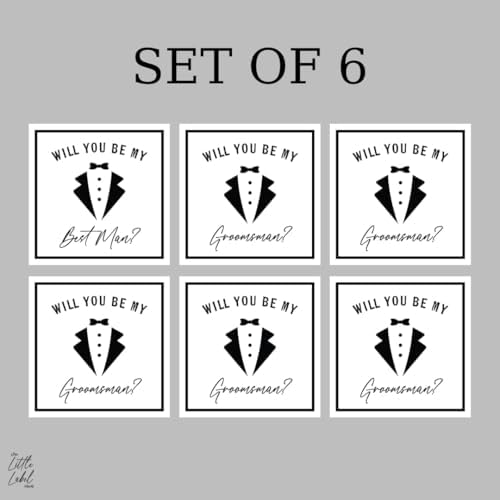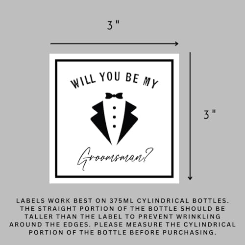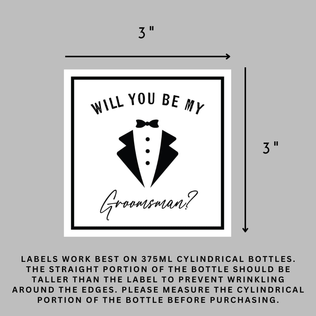 These groomsman proposal labels are 3 W X 3 L” and made to fit 375ml cylindrical bottles. They are easy to apply and add that extra special touch to your groomsman proposal gift!
