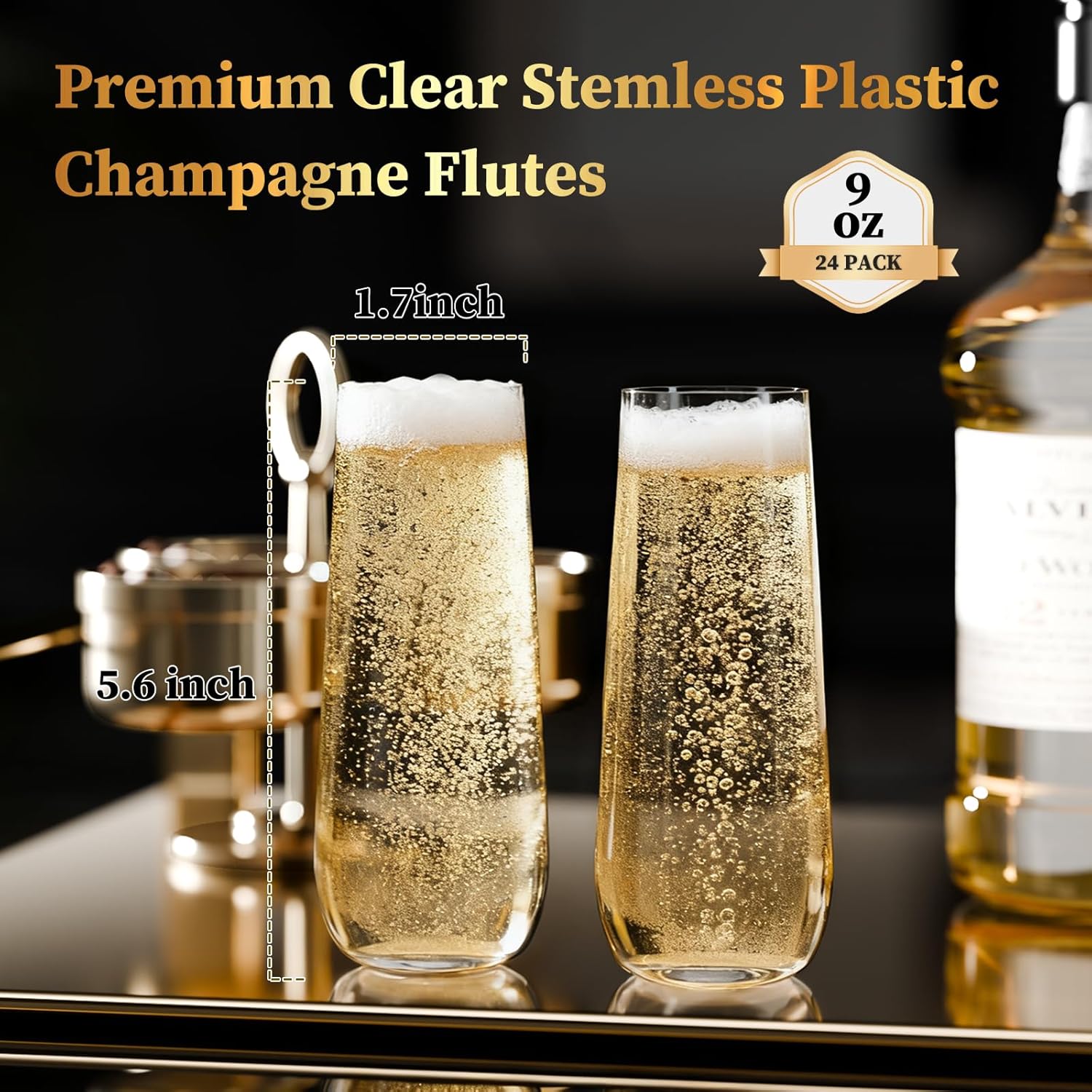- 【Preimum Champagne Flute】Indulge in the perfect blend of luxury and durability with our 9oz stemless champagne flutes. Crafted from heavy-duty, crystal-clear plastic, they offer a glass-like appearance without the fragility. Perfect for adding a touch of class to weddings, parties, and any special celebration.