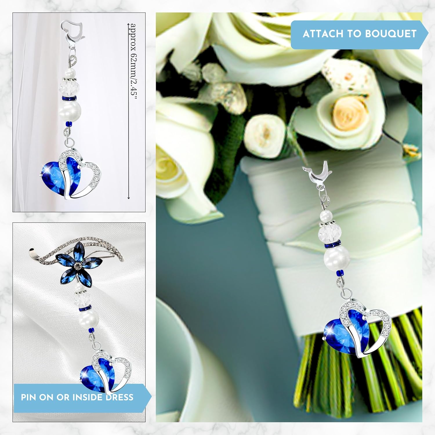 - HER CHERISHED KEEPSAKE: Each “something blue” heart charm is meticulously crafted to symbolize love, protection, and lasting reflections for the bride on her wedding day. The heart which represents steadfastness and affection, makes it a treasured memento she can carry close. Its heart-shaped clasp easily attaches to a bouquet or can be pinned wherever she desires.