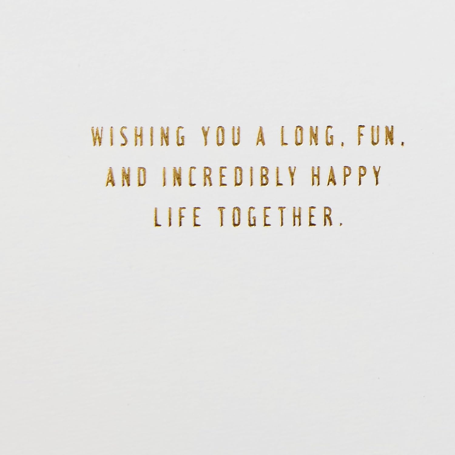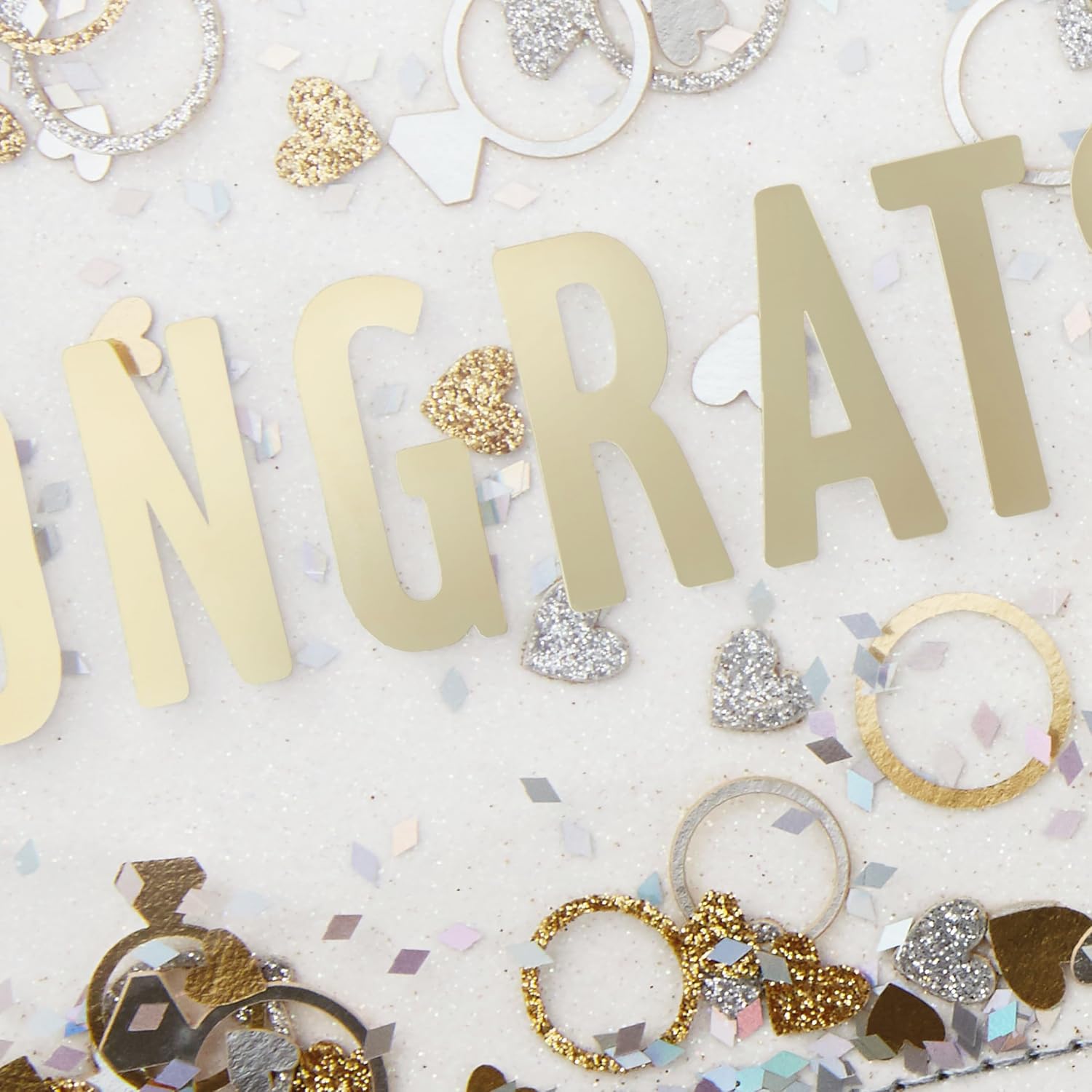 • Fun card features a sealed clear overlay filled with free floating engagement ring and hearts confetti acccented with glitter and foil. Inside reads: “Wishing you a long, fun, and incredibly happy life together.”