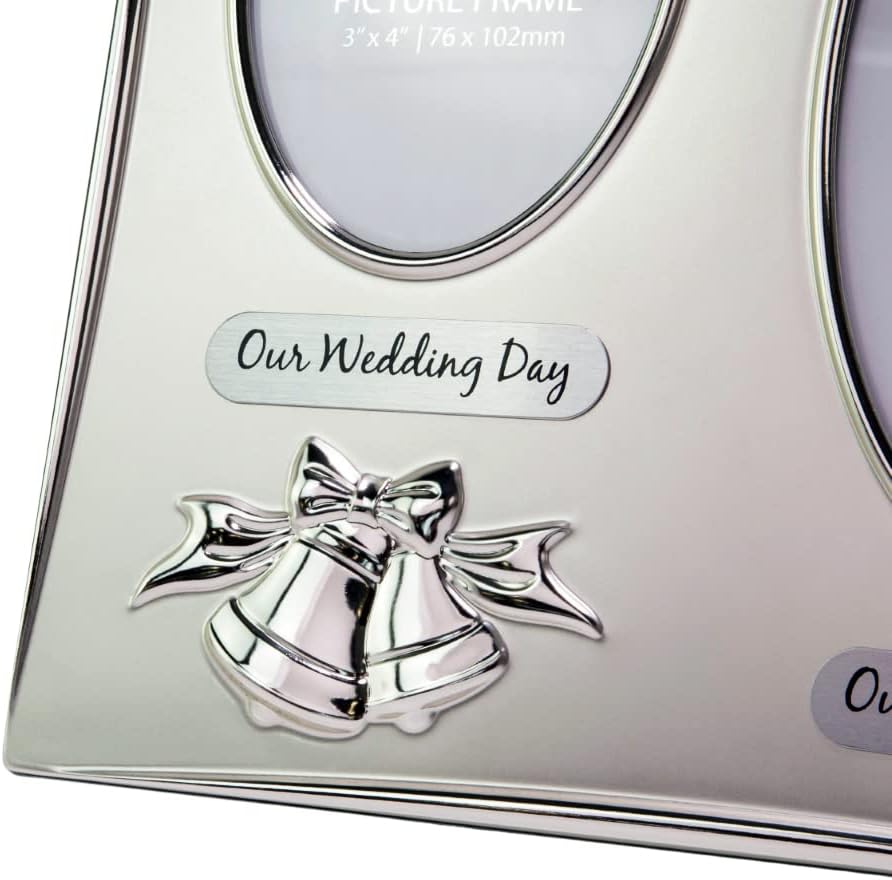 - The photo frame has a beautifully embossed design of two silver plated bells with a matching silver coloured ribbon.