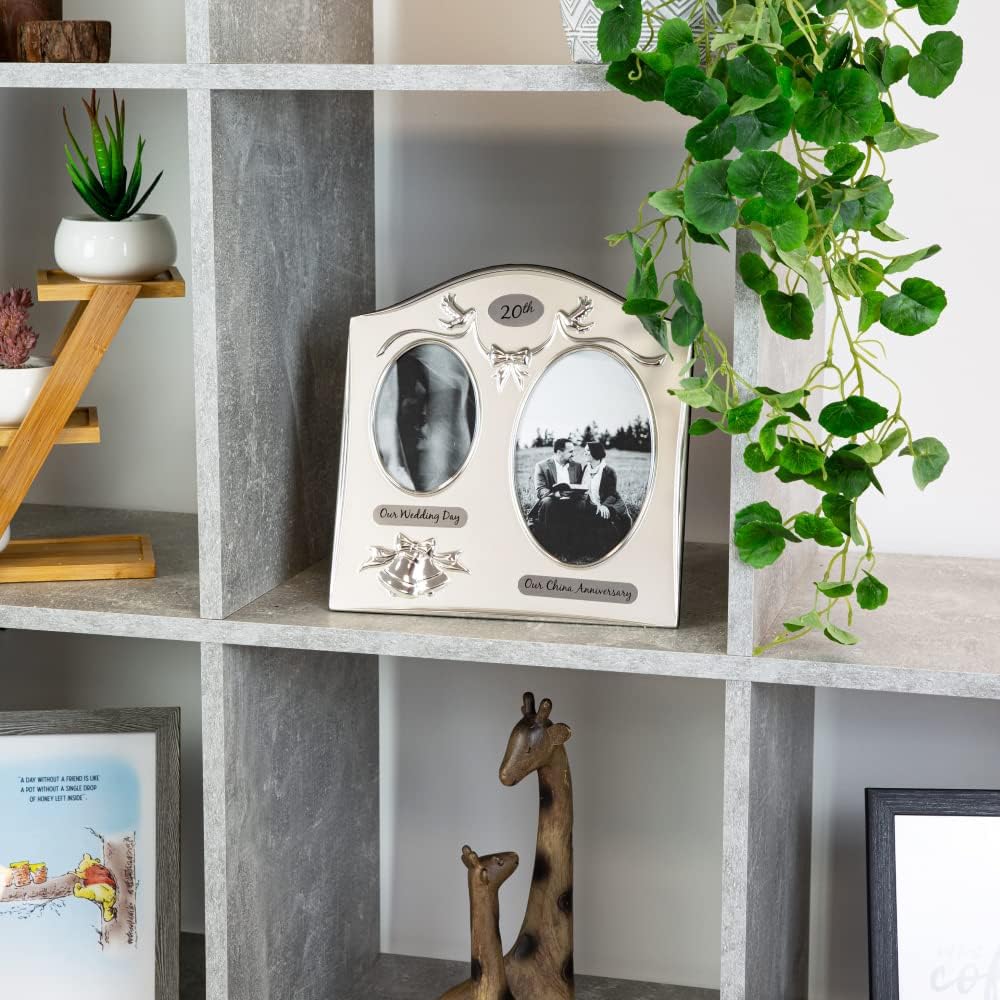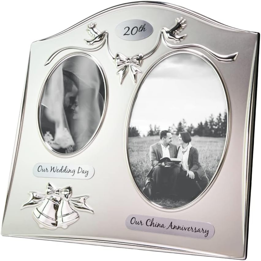 Beautifully designed two tone matt silver 20th china anniversary picture frame. The photo frame has a beautifully embossed design of two silver plated bells with a matching silver coloured ribbon. The photo frame is designed to hold two photographs. One photograph of the wedding day and the other twenty years on! The oval wedding day photo will take a photo approximately 3″ x 4″ and the anniversary space holds approximately 4″ x 6″. This makes a wonderful keepsake special gift for a very special couple celebrating their 20th wedding anniversary.