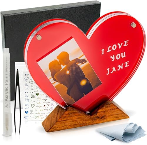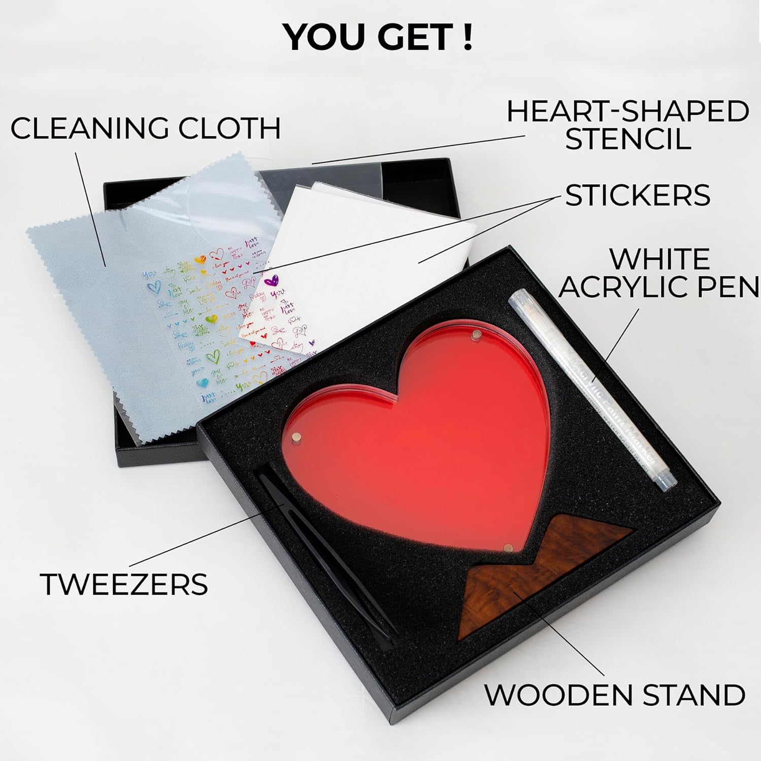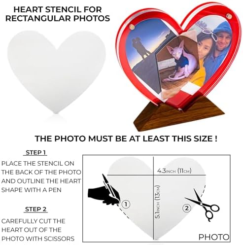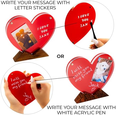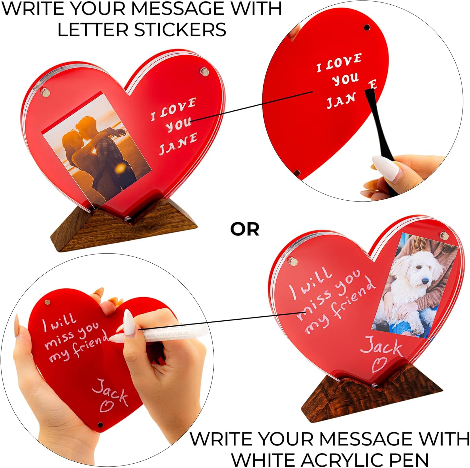- Complete Set: Includes the magnetic heart shaped photo frame, a wooden stand, a white acrylic pen, tweezers, a small cleaning cloth, letter stickers and heart shaped cutting tool