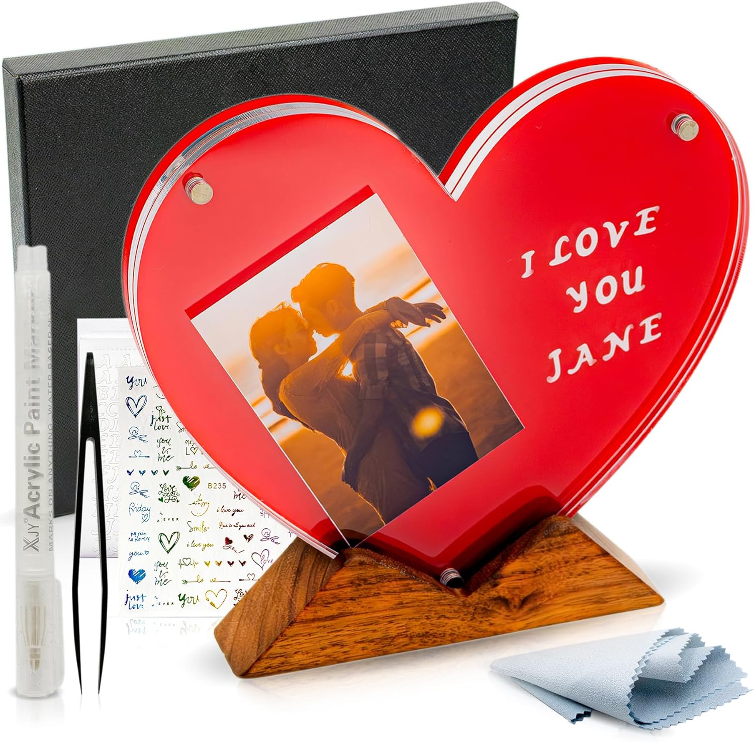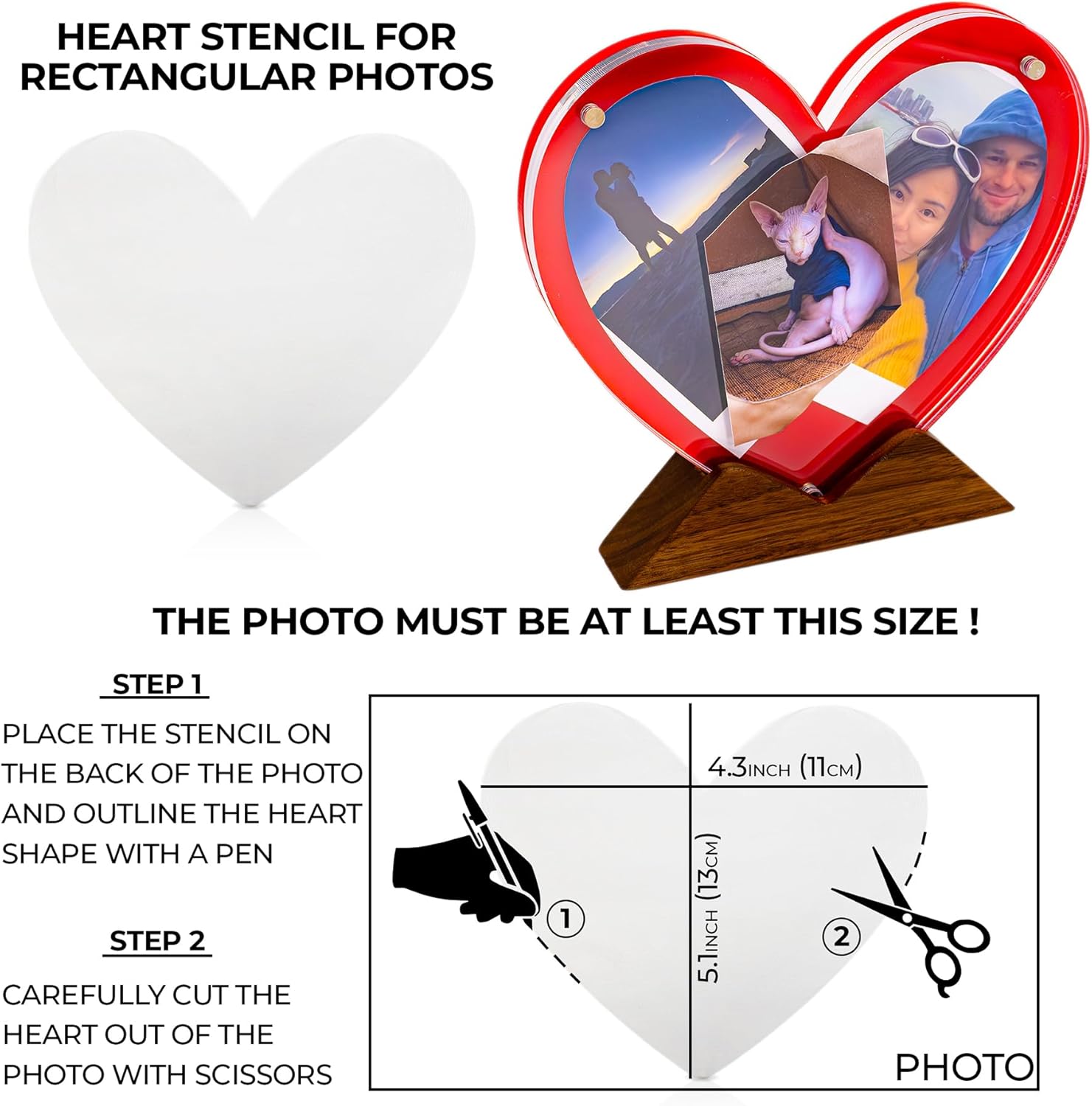 Capture your most cherished memories in a unique and elegant way with our Heart-Shaped Magnetic Acrylic Photo Frame Set. This beautifully designed photo frame features three durable acrylic layers, held together by strong magnets, allowing you to easily insert and adjust your photos. The customizable design lets you add personal touches with included stickers or handwritten notes using the white acrylic pen.Perfect for anniversaries, weddings, Valentine’s Day, or as a heartfelt gift for a loved one, this photo frame set comes complete with everything you need. The set includes a heart-shaped cutting tool to perfectly trim your photos, a stand for displaying your frame, and a stylish gift box for a ready-to-give presentation. Plus, with the included tweezers and cleaning cloth, maintaining the pristine look of your frame is simple and hassle-free.Celebrate your special moments and create a lasting keepsake with this versatile and thoughtful photo frame set, perfect for all ages and occasions.