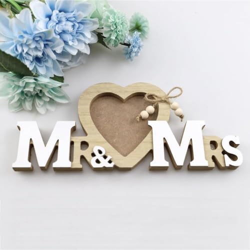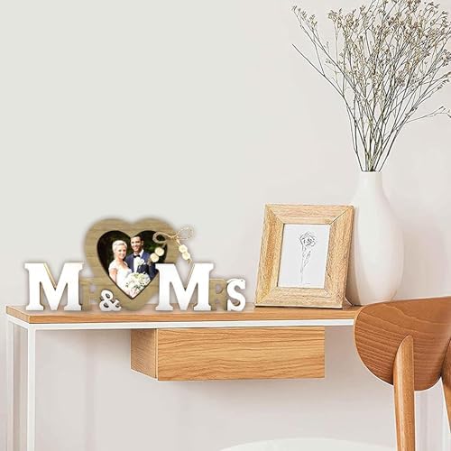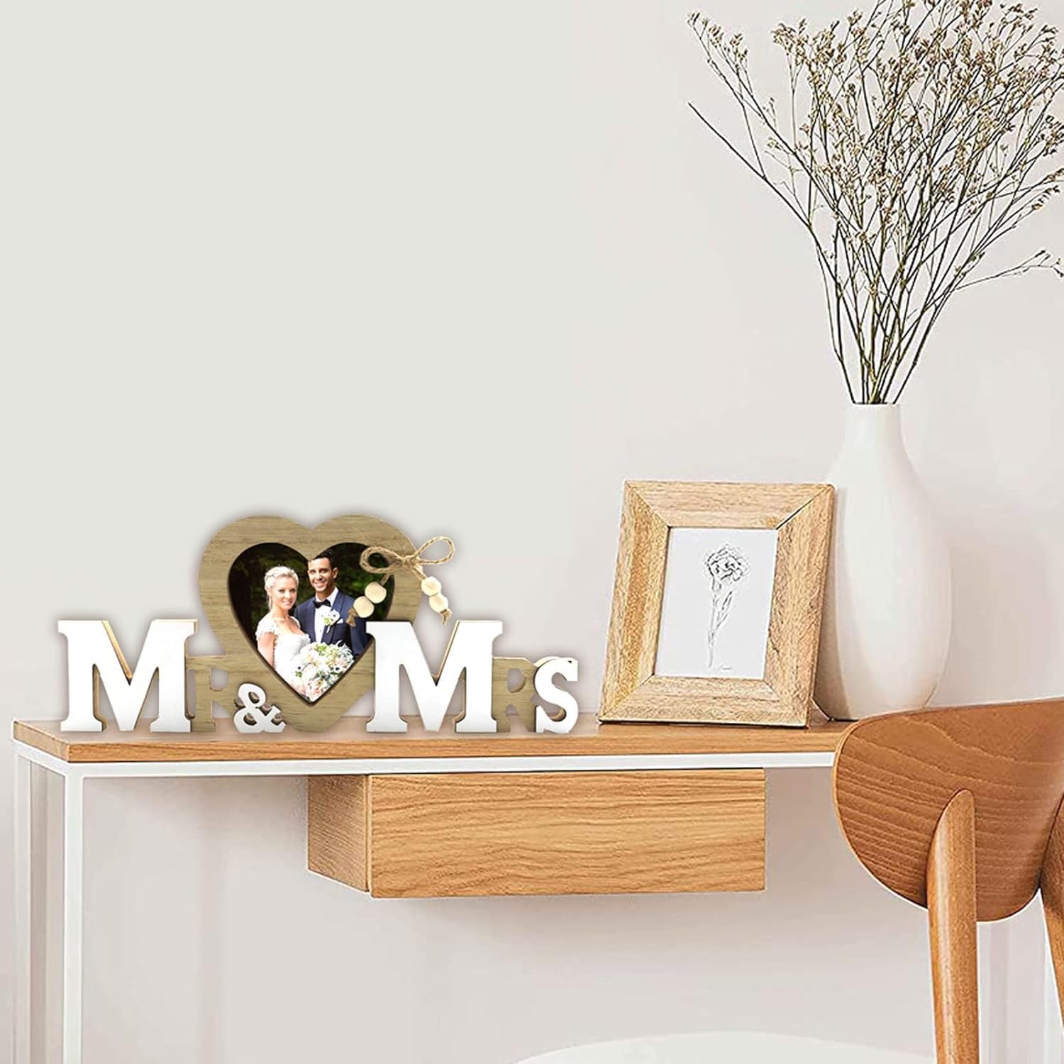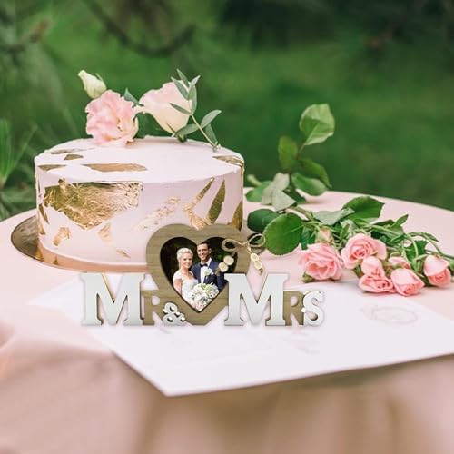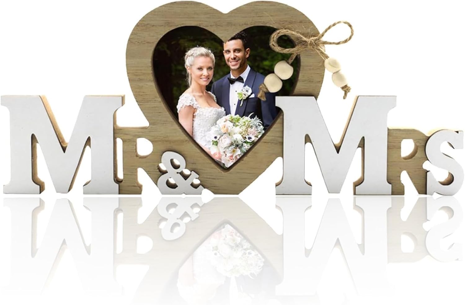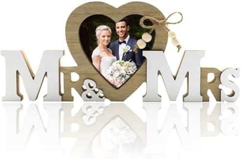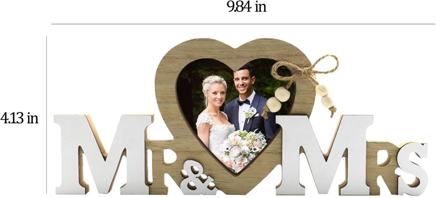 Premium Material:The wedding picture frames are made of wood.The Mr and Mrs picture frame make it a thoughtful cool wedding gifts for couples engagement gift, expressing your deep love to your beloved one and hit the spot on your special day.Size:The heart shaped wedding picture frame is 9.8 x4.3 x 0.6 inches. This Mr and Mrs photo frames will hold your perfect3.15 x 3.15 inches photo and compliment any part of your home with this product.Occasion:Stand the wedding gift on bedside, table tops, desk,shelf. Decorate your living room, bedroom, study, office, Create a warm and romantic touch to your home decor or beach wedding.Imagine your loved one embracing you with excitement when receiving the wedding gifts for couples unique prepared for him or her.our bridal gifts for bride couple gifts newlywed photo gifts will personalize your wedding picture and protects the treasured photo from fade, dust, water. Definitely a perfect keepsake frame to display the love story & precious memory between you and your lover.Meaningful Gift: Still looking for a romantic gifts for her wedding anniversary decorations personalized picture frame for someone to make him or her a surprise? Elevate the gifting experience with our frames, our photo frame for wedding gift is your best choice for engagement gifts for her him, couple, husband, wife, parents,wedding anniversary gifts for wife husband, 1 year anniversary gifts for him her, 10 year anniversary gifts for wife.Tips: Only for decoration purposes, this is not edible and please do NOT use it in oven or microwave.
