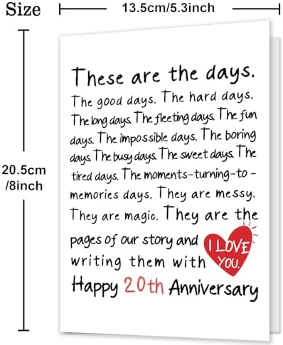 - 20 Year Anniversary Gifts: Includes one anniversary card and one envelope. Card size is 5.3 inches wide and 8 inches long.
