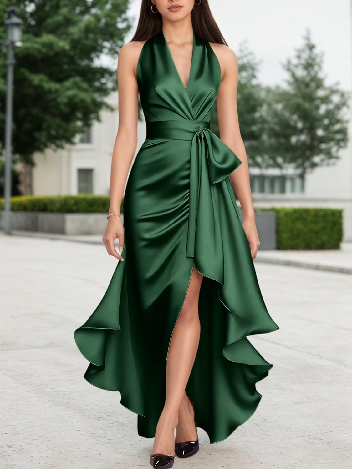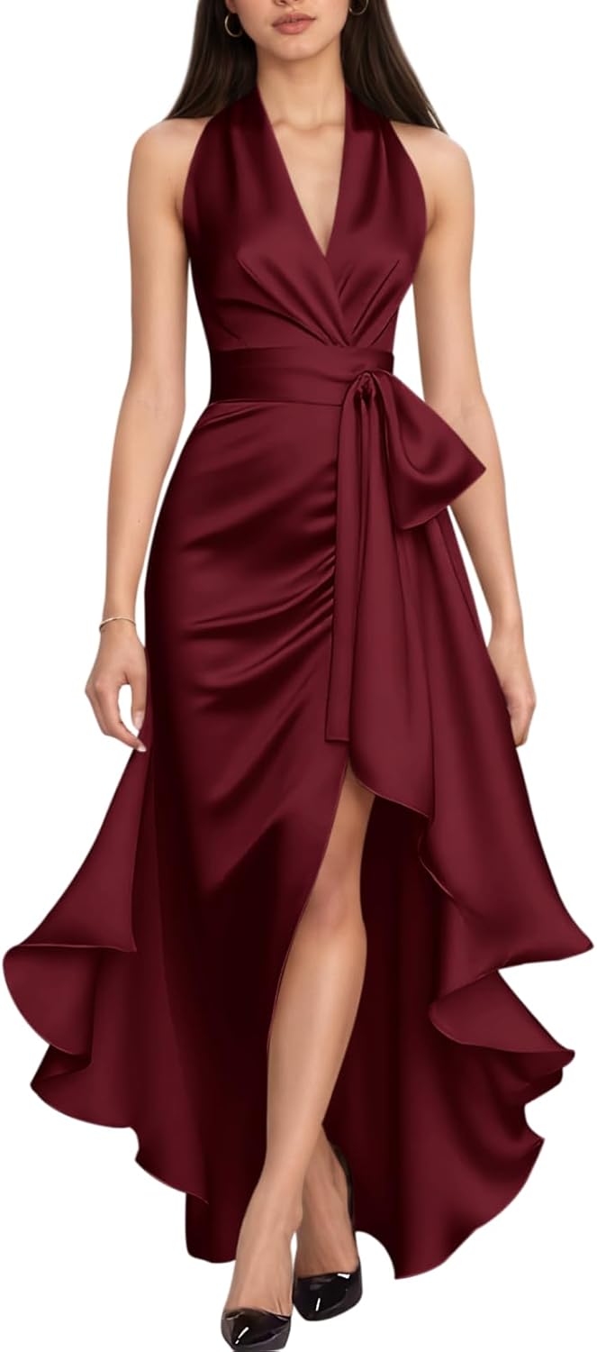 - details:satin halter prom dresses for women v-neck high low formal evening gown a-line elegant wedding guest dress,women’s v-neck satin bridesmaid dresses 2025 high low a-line halter formal evening cocktail party gown tie waist,high low casual dress for wedding v-neck ruffle satin formal dress strappy halter gown.