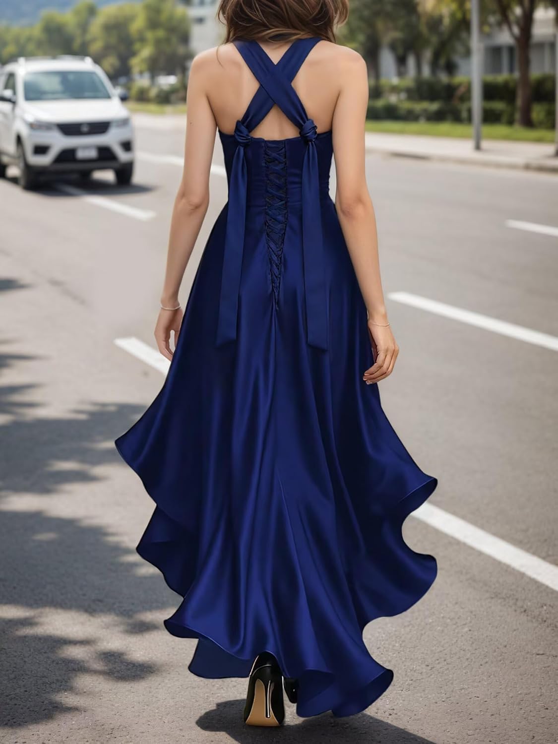 - features:women’s elegant v-neck prom dresses halter gown 2025 sleeveless a-line satin cocktail formal dresses high low,v-neck high low prom dresses for women a-line simple evening gowns satin wedding guest dress,a-line pleated bridesmaid dress for teens v-neck sleeveless high low casual party maxi dress tie waist strappy.
