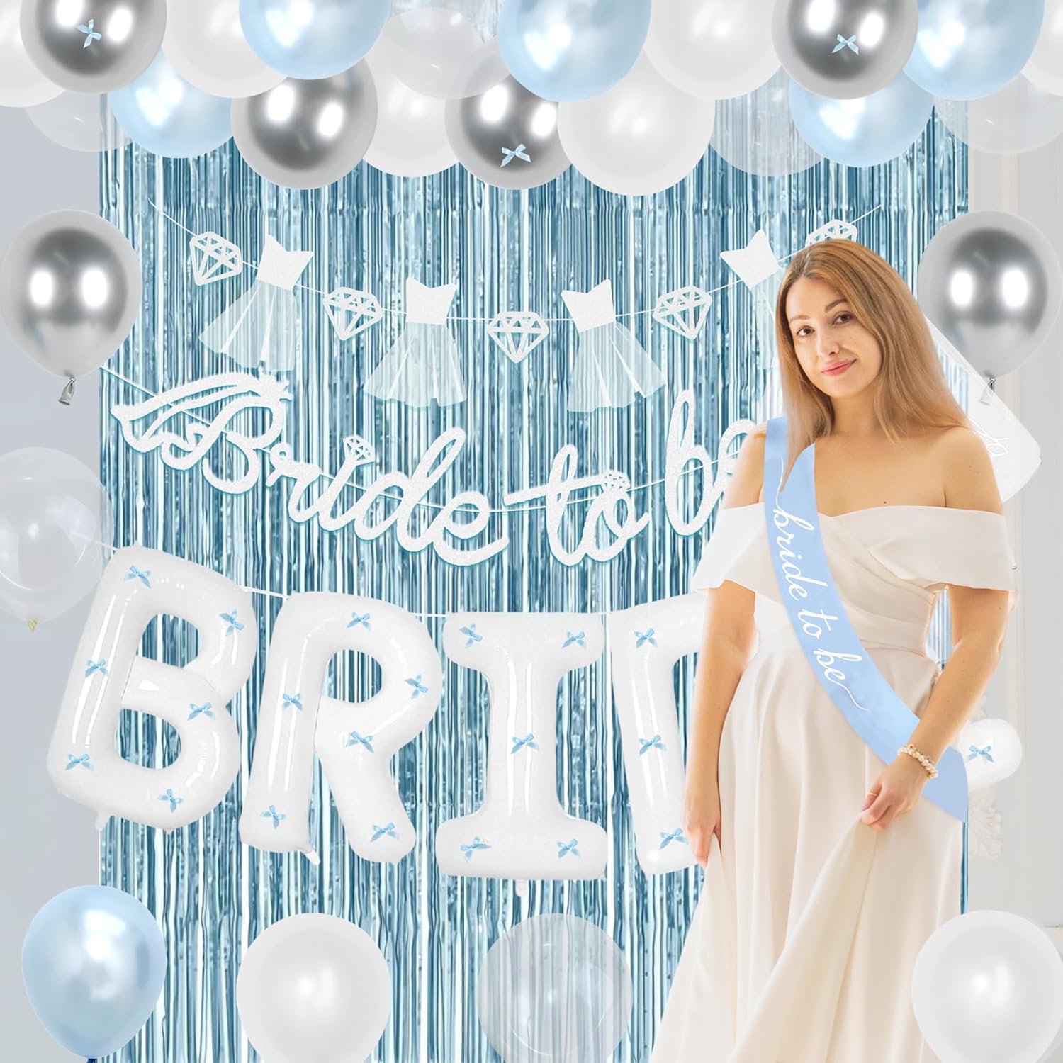 - 【Bachelorette Party Set】: Includes 1pcs white “bride to be” banner, 1pcs fun Bridal Veil Pattern hang banner, 1pcs light blue sash, 1pcs white Bridal Veil (with fixation), 2pcs light blue Foil Curtain, 20pcs 12-inch latex balloons, 1pcs 40-inch letter BRIDE aluminum model balloon , 30pcs blue butterflies, 1pcs rope, 1pcs glue; Choosing light blue bachelorette decorations can to your Bachelorette Party dress, making it the best choice for hosting a perfect bachelorette Party. Take beautiful and warm photos with him/her, family and friends, and leave elegant and dreamy memories.
