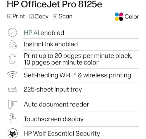 The HP OfficeJet Pro 8125e delivers fast color printing, 225-sheet paper capacity, and scan and copy capabilities. It’s AI-enabled to intuitively adapt to your workflow, with wireless and security features that keep your multifunction printer up to date and secure.