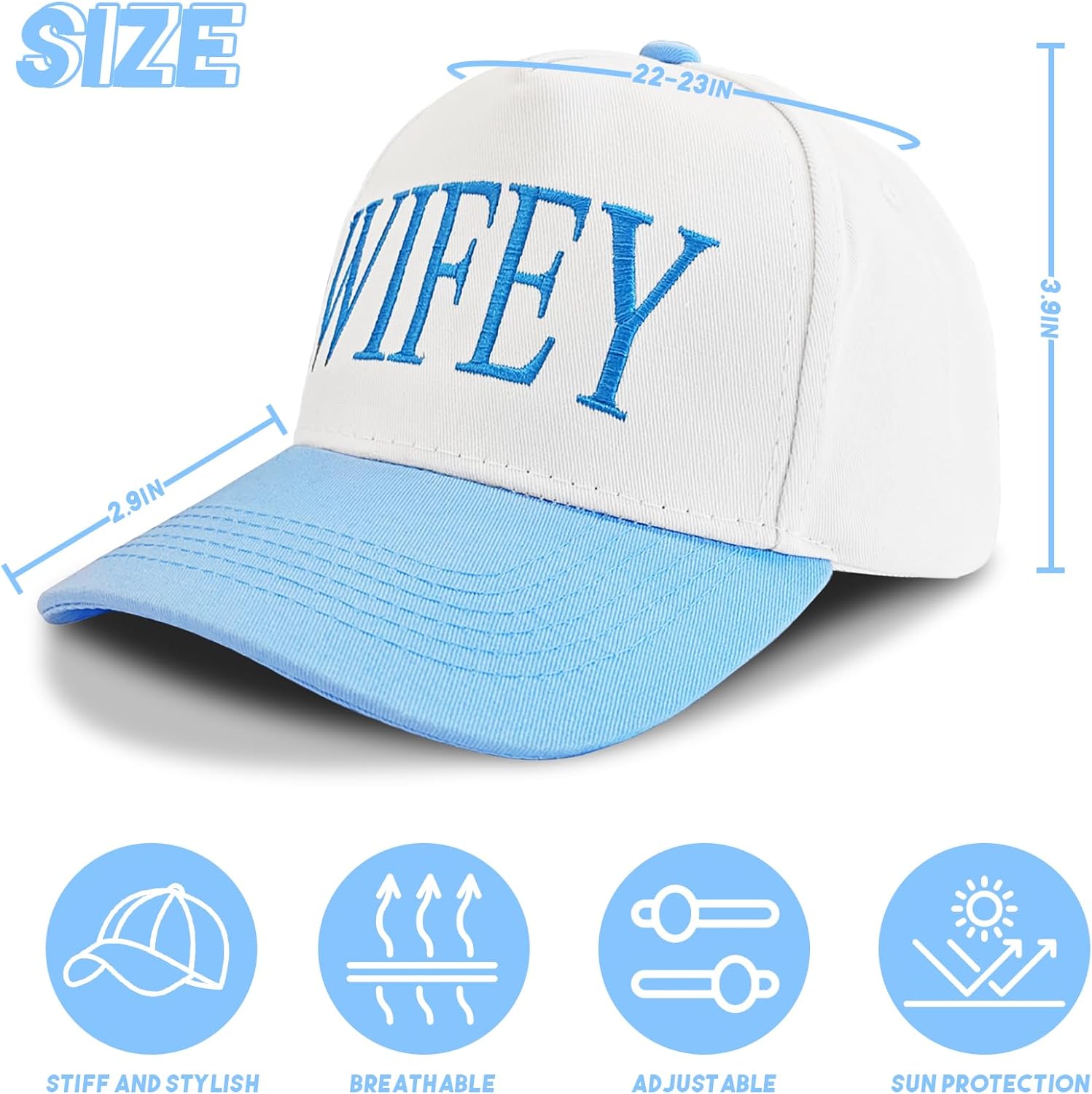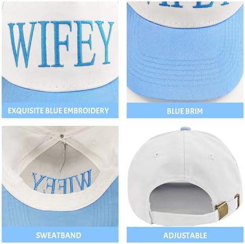 - Adjustable Wifey Hat: Baseball cap circumference: 22-23 inch/55-59 cm, brim: 2.9 inch/7.5 cm, hat height: 3.9 inch/10 cm, with an adjustable metal buckle on the back to adjust the head circumference according to needs to ensure comfortable wearing