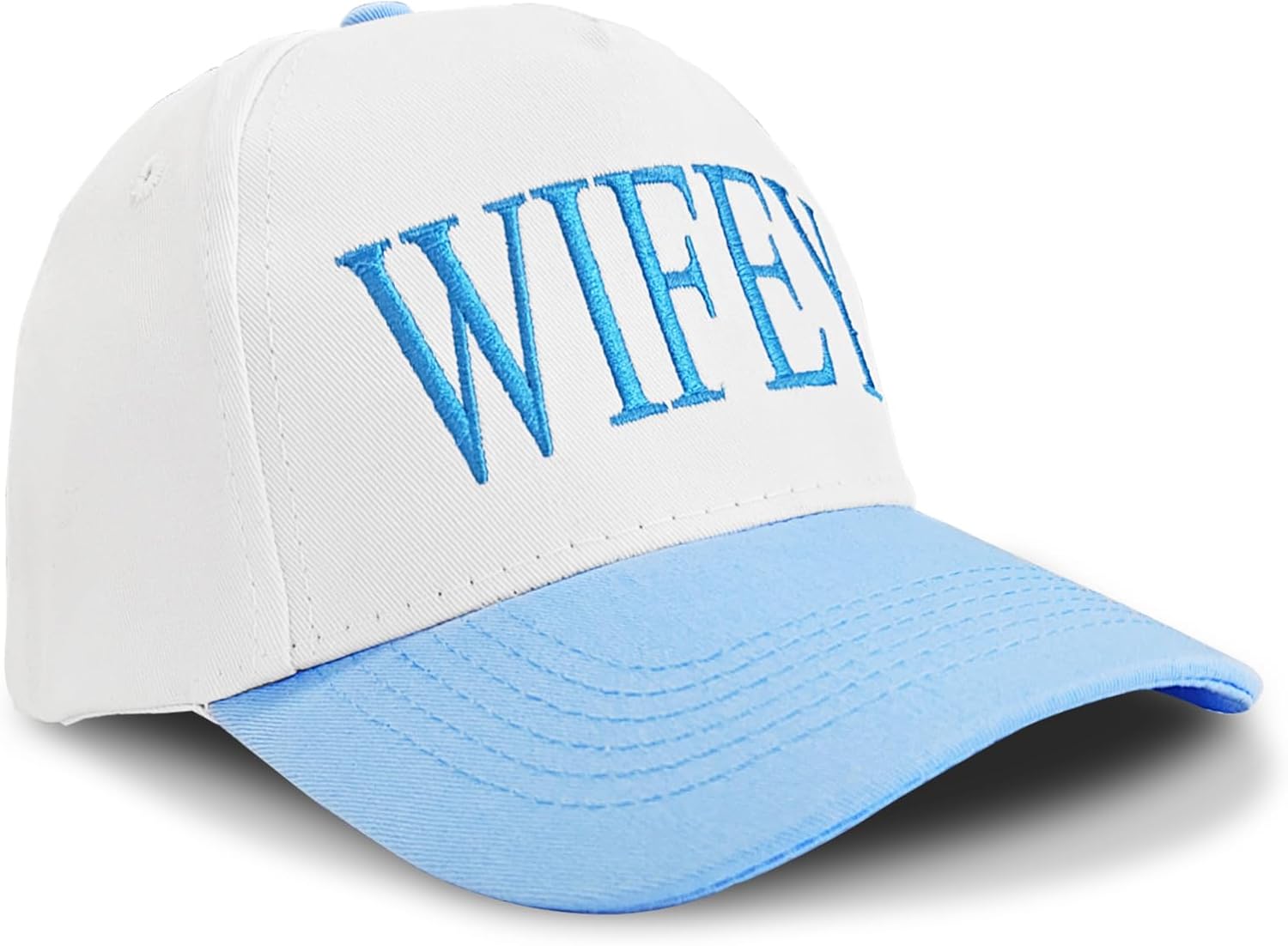 - Gifts for Bride: Wifey baseball cap is made of cotton and polyester, 5 panel construction, stiff and shaped front, 4 embroidery holes, sweat band inside to increase the breathability of the baseball cap. 2.9 inch visor design protects her from the sun and UV rays during the honeymoon, providing maximum coolness and comfort for the bride
