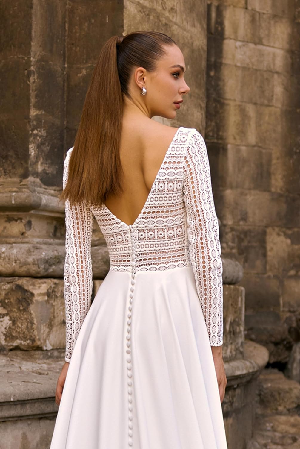 Idan This A-cut wedding dress is made out of Macram lace and satin. Designed and handmade in Europe this dress can be sewn custom to your measurements and has other customizable options. *The price doesnt include accessories.