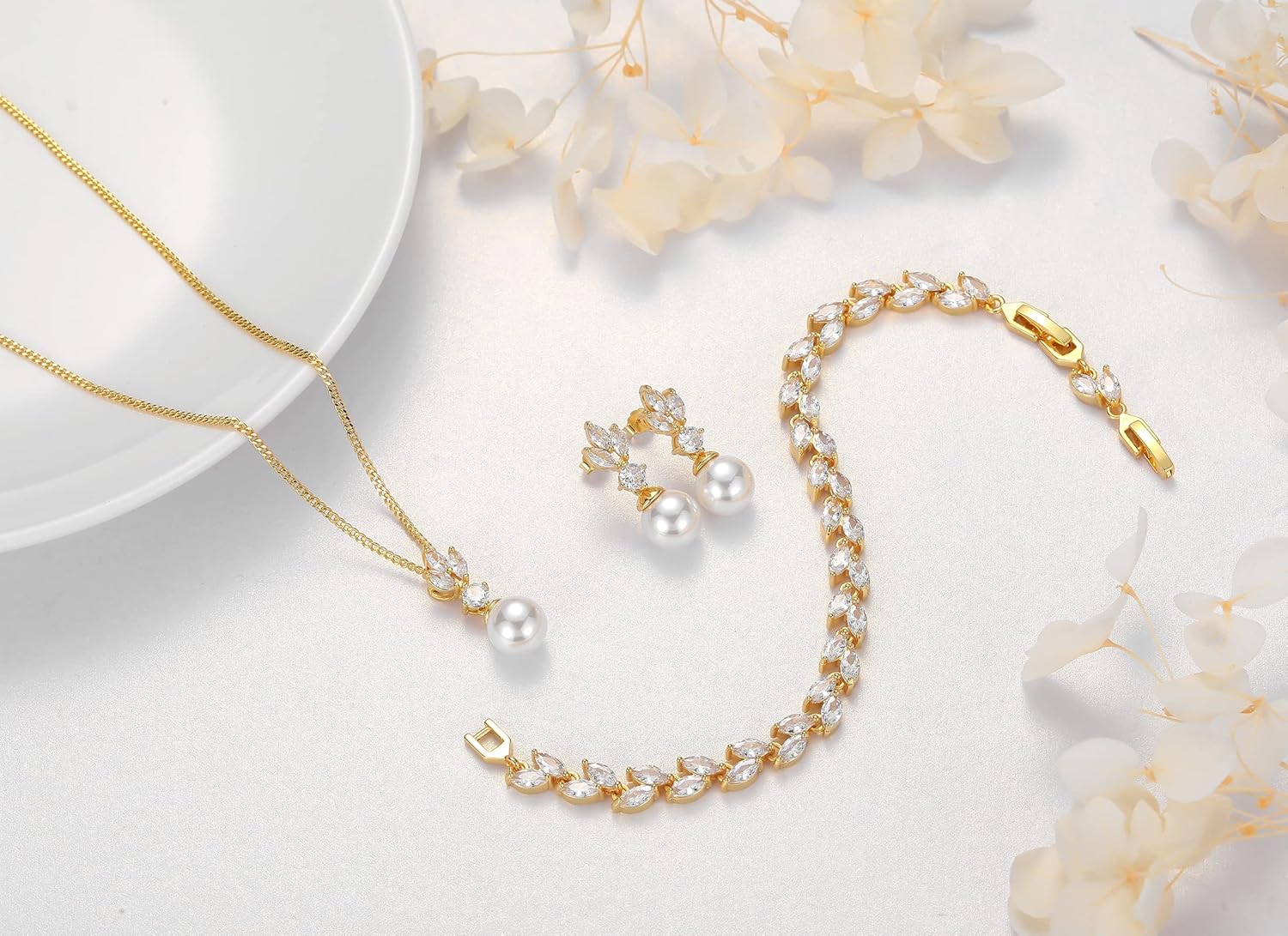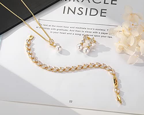 - Premium Quality Jewelry Set: Package including 1 piece of necklace, 1 piece of bracelet and 1 pair of earrings. Adorned with selective zircon stones, crafted in eco-friendly 14K gold, lead-free and nickel-free, this dainty jewelry set is born to match your gorgeous beauty